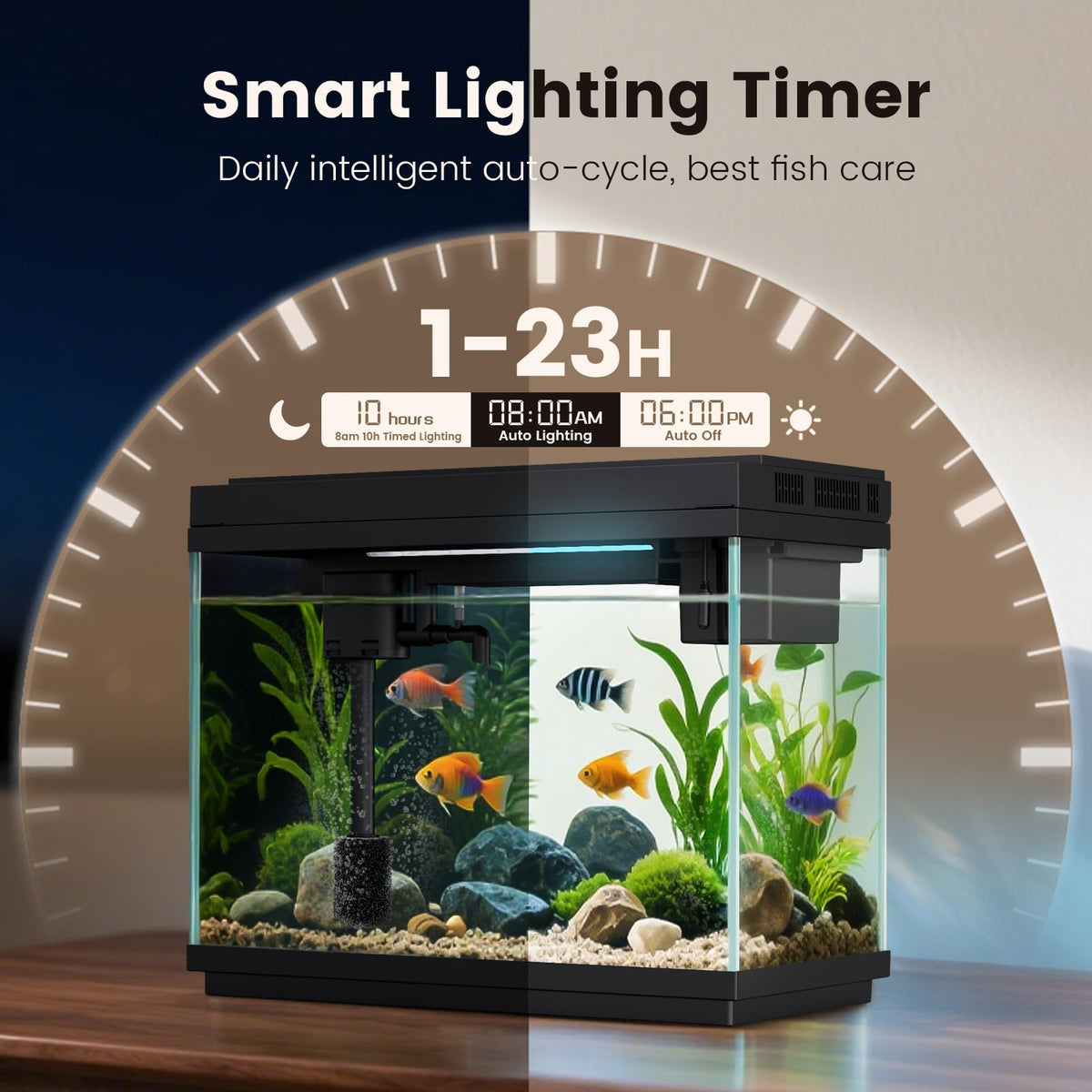 FISHKEEPER 2.3 Gallon (9 L) Smart Glass Aquarium Starter Kit - All-in-One Tank with Auto Timer, 8-Color RGB LED, Self Cleaning & Aromatherapy Transform your space with the FISHKEEPER smart glass fish tank - the ultimate 2.3 gallon fish tank that combines beauty, innovation, and effortless maintenance. Perfect for small fish, betta, shrimp, or aquatic plants, this all-in-one aquarium delivers a stunning underwater display while keeping your pets healthy and happy. Why Choose Our Fish Tank Kit? 1. Plug & Play Setup - No assembly needed! Unbox, add water, and enjoy. The built-in LED light, 4-in-1 water pump, and self-cleaning filtration make it ideal for beginners, aquarium enthusiasts, or as a unique gift. 2. 8-Color RGB LED + Smart Timer - Customize your underwater world with vibrant 5050 RGB lighting (8 colors, 0-100% dimming). The auto timer (1-23H) mimics natural day/night cycles, promoting healthier fish while saving energy. 3. Whisper-Quiet 4-in-1 Filtration - The multifunctional water pump handles filtration, oxygenation, and circulation at