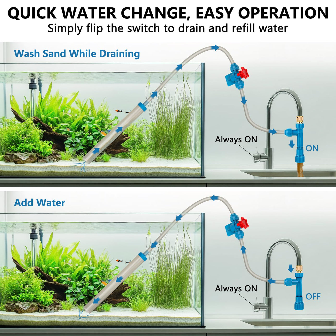fishkeeper Gravel Vacuum for Aquarium Water Changer Fish Tank Cleaning Tools, Siphon Universal Quick Pump Aquarium Water Changing (25ft) The fishkeeper Bucket-Free Water Change Kit is designed to help eliminate the potential for messy aquarium spills and transporting heavy buckets of water. Simply attach the water flow assembly to the faucet using the included multi-connection faucet adapter and turn on the faucet. By adjusting the flow direction, fish tank water changer can be used to remove water as well as add water back into aquarium. It makes routine water changes easier and also vacuums out the debris in the gravel. Quick Water Change: Only two valves and a long hose are needed to quickly complete the water change of the fish tank, and use the pressure of tap water to drain water. This semi-automatic water changer is suitable for medium and large fish tanks. No Buckets, No Spill, No Noise: Easy to install and simple operation, no bucket required, the dirty water in the fish tank is drawn out under the pressure of tap water, After the drain is completed, just switch the valve to add water. Gravel Cleaning: The 14.48inch long cleaning tube of fish tank gravel cleaner has a built-in filter. When draining, gently agitate the aquarium gravel vacuum to remove the debris. It will not make noise and the fish will not be disturbed. Suitable for Most Faucets: The aquarium cleaning tools come with a 1 GHT garden hose adapter, 41/50 threaded faucets adapter, 9/10 threaded faucets adapter, 15/16 brass metal threaded faucets adapter, 13/16 brass metal threaded faucets adapter, 33/50 brass metal faucets adapter, and it is suitable for all quick connectors. Water Flow Adjustable: FISHKEEPER aquarium siphon gravel cleaner has a unique flow adjustment device, which can control water volume as needed.