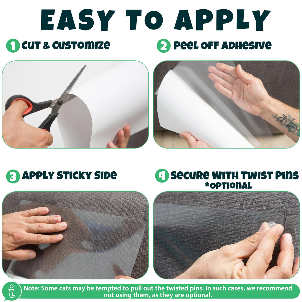 This Cat Furniture Protector is designed to keep your furniture safe from your cats natural scratching behavior. Made with durable materials, this anti-scratch furniture protector provides a protective barrier between your furniture and the sharp claws of your furry companion. The couch protector for cats scratching is flexible, transparent, and easy to install, and it can be cut to size for customized protection. In addition to the couch protector, this set also help to couch corner protectors for cats, ensuring that every part of your furniture is covered. Our anti-scratch furniture protector is designed to be both effective and safe, so you dont have to worry about it damaging your furniture or harming your cat. Our cat anti-scratch for furniture products are an effective way to stop cat scratching furniture and redirect your cats natural scratching behavior to a more appropriate location. With our cat scratch protectors for furniture, you can finally say goodbye to scratched-up furniture and hello to a happier cat and a happier home. Our pet furniture protector is the perfect solution for furniture protection from cat scratching, and this cat scratch couch guard ensures that your furniture stays looking as good as new. This help also the cat scratcher couch corner, your cat will have a dedicated spot to scratch, keeping your furniture safe and your cat happy. In short, our Cat Furniture Protector set your help everything you need to protect your furniture and train your cat to scratch appropriate surfaces. The couch protector for cats scratching saves your furniture instantly, our set is designed to make your life easier and your home more harmonious. Order yours today and enjoy a happy, scratch-free home with your furry friend!