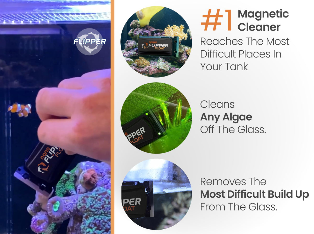 Floating Flipper algae remover for aquariums is made with rare earth magnets for incredible cleaning strength and durability and cleans even the most stubborn Coraline algae. The blade side has only 3 contact points. This results in a safety gap between the cleaner and the glass which minimizes the chance of trapping sand, thus reducing the chance of scratching, even when cleaning below the sand. The Flipper floats to the top of your aquarium if the cleaner ever becomes detached, and the unique orienting buoyancy always keeps the magnets facing the glass for even easier retrieval! Choose Your Floating Flipper fish tank accessories based on the size of your tank: * FLOATING FLIPPER NANO - For Use on Glass Tanks ONLY up to 1/4' (6mm) Thickness - Up to 25 Gallons * FLOATING FLIPPER STANDARD - For Use on Glass or Acrylic Tanks - 1/4' - 1/2' Thickness - 30-150 Gallons * FLOATING FLIPPER MAX - For Use on Glass or Acrylic Tanks - 5/8'' - 1'' Thickness - 150+ Gallons