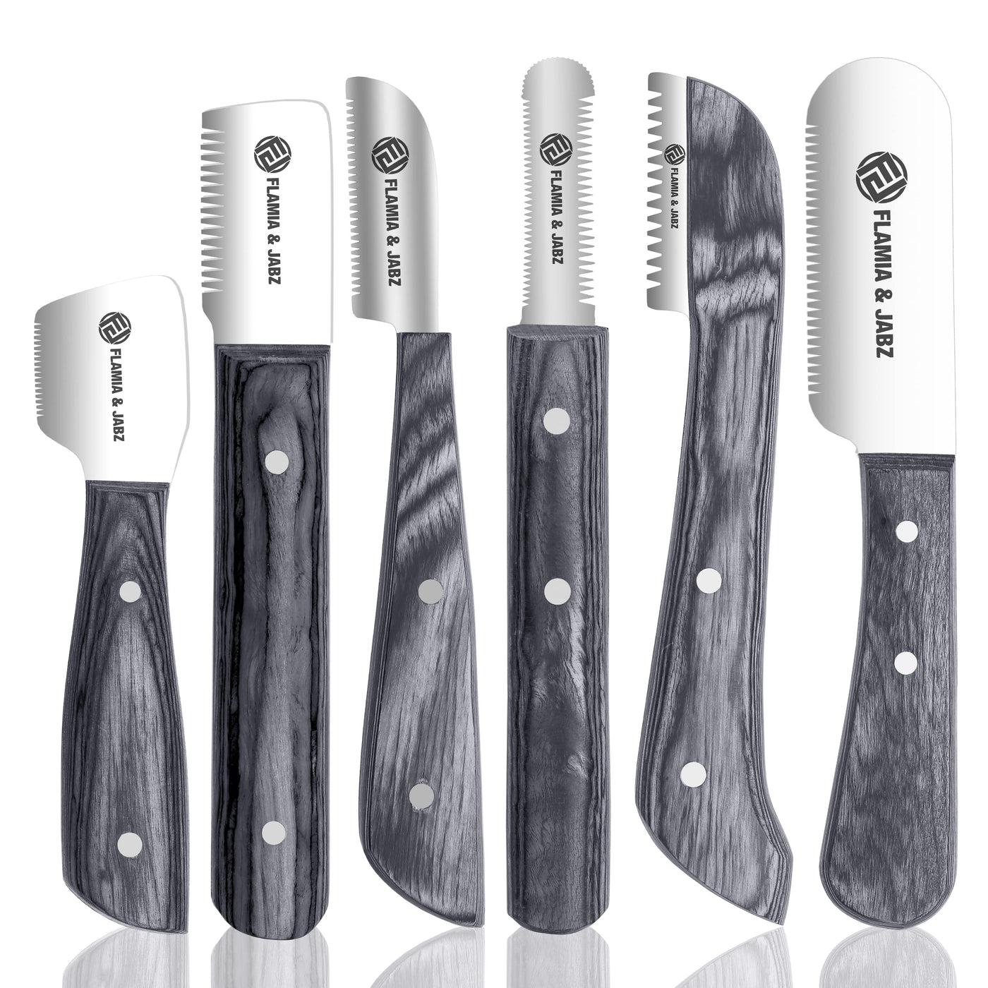 Flamia & Jabz Fj Professional Stripping Knife Kit (6 Pieces Set) For Dogs & Pets, Wooden Handle Grip With Stainless Steel Blade (Right Handed) (Black)