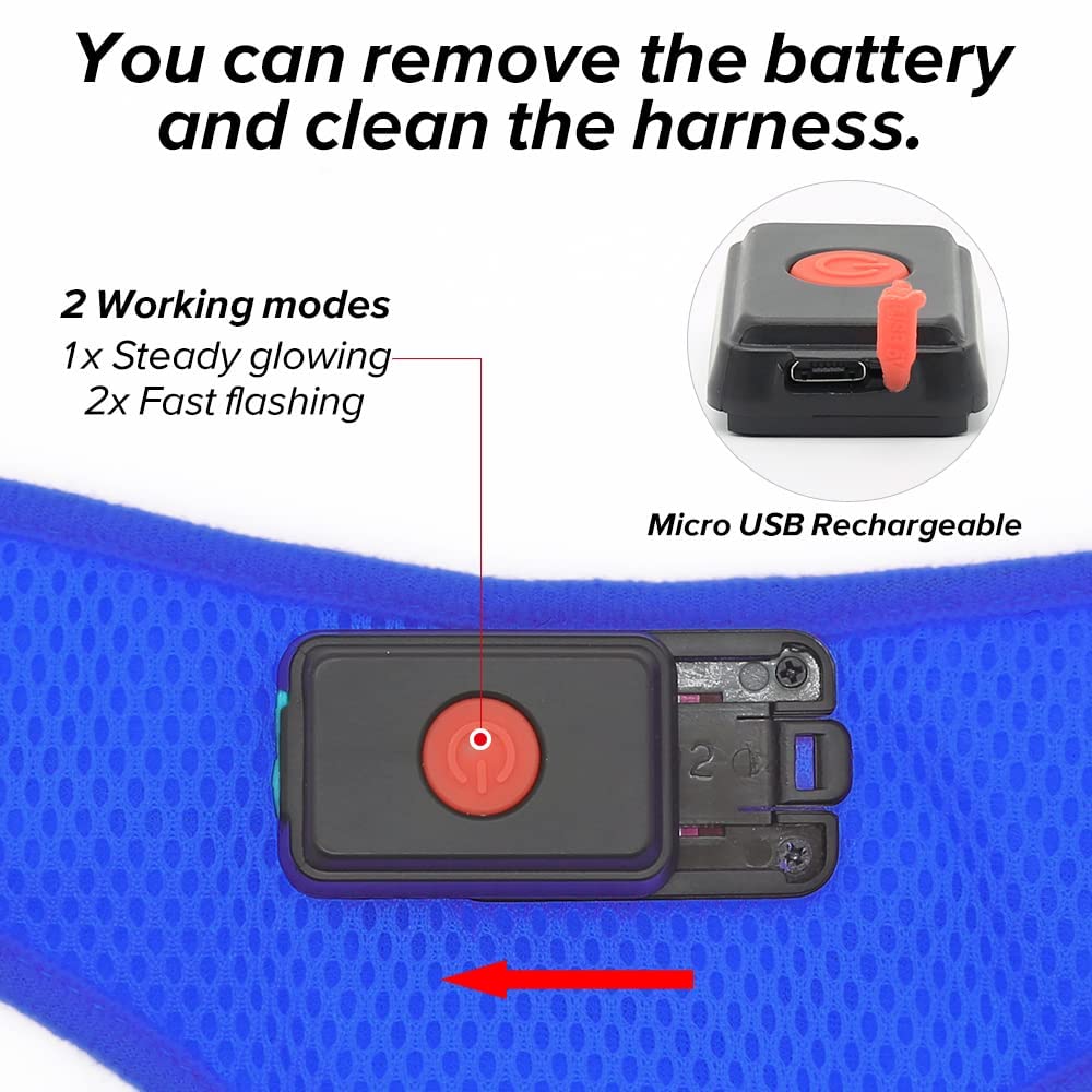 ??Flashseen USB Rechargeable LED Dog Safety Harness Offers You Super Bright Glowing Light to Keep Your Dog High Visible and Be Safe Walk to Avoid Some Potential Traffic Dangers In The Dark ?? 2 Modes Glowing Light-- The light mode can be changed by click switch button. Charging 2 hours could last for 8 hours for blink model or 4 hours steady glow. ?? Light Weight & Heavy Duty: Flashseen's LED Dog Harness is Made using 100% Non-Toxic Meshing and Polyester to ensure make your dog’s skin feel soft and comfortable. ?? Super Bright LED Light: Making you can find your dog easily in the dark night and it will provide the high visibility to walkers, joggers, cyclists, motorists etc. ?? Three color:Blue Pink Green Adjustable Size: Small Size: 9.05-12.59 inch Medium Size: 14.6-18.9 inch Large Size: 18.9-23.2 inch ?? Package Includes: 1* LED Dog Harness 1* Micro USB Cable ?? Warranty: Flashseen is committed to 100% Satisfaction and 60 Days Guarantee for our customers. So any problem, please feel free to contact with us! Our Friendly Service - 24 hours email customer service response.