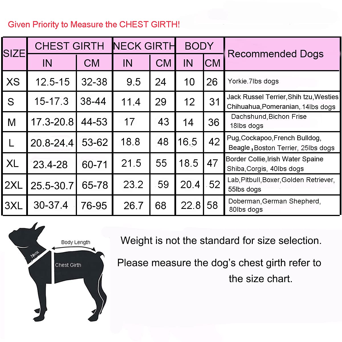 Winter Dog CoatSize Chest Girth------ Neck Girth------Body Length Xsmall: 13.3-17inch--------9.5inch-----------10inch, recommended dogs:Yorkie,Chihuahua Small: 16.1-20inch---------11.4inch----------12inch,recommended dogs:Jack Russell Terrier,shih tzu,dachshund,Westies,Pomeranian,Chihuahua Medium: 18.5-22.4inch--------13inch----------14inch,recommended dogs:Boston Terrier,Pug,French Bulldog,Dachshund Large: 21.2-24.8inch--------17inch----------17inch,recommended dogs:Cockapoo,Beagle,Basenji,30lbs dogs Xlarge: 24-27.9inch-------17inch-----------17inch,recommended dogs:Border Collie,Vizsla,Irish Water Spanie,45ls Pitbull 2Xlarge:26.3-31inch---------19inch----------18.5inch,recommended dogs:Lab,Pitull,Boxer,Golden Retriever,American TerrierHow to choose the right size ? 1.Always look at the size chart for chest girth,body length,neck girth.GIVE PRIORITY to the chest girth. 2. Donot choose the size by weight only,because various dogs may have same weight but different size. 3.If any of the measurements are 'between' two sizes, choose the larger size. 4.Your baby usually wears size S doesn't mean all size S will fit him/her. Different designers and manufacturers use their own size charts.If you have any questions about sizes feel free to contact us. We will be happy to help you. We are so confident in our Dog Clothes that we offer a 30 day Money Back.?'
