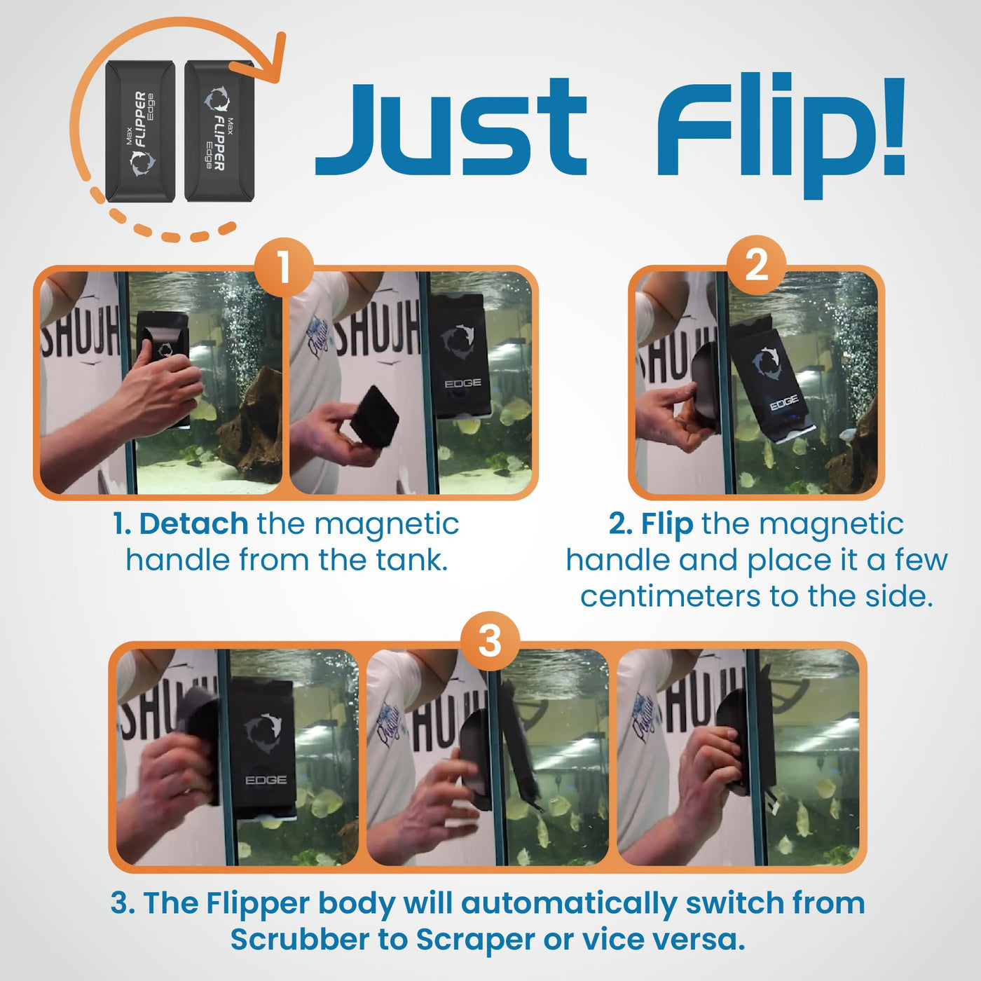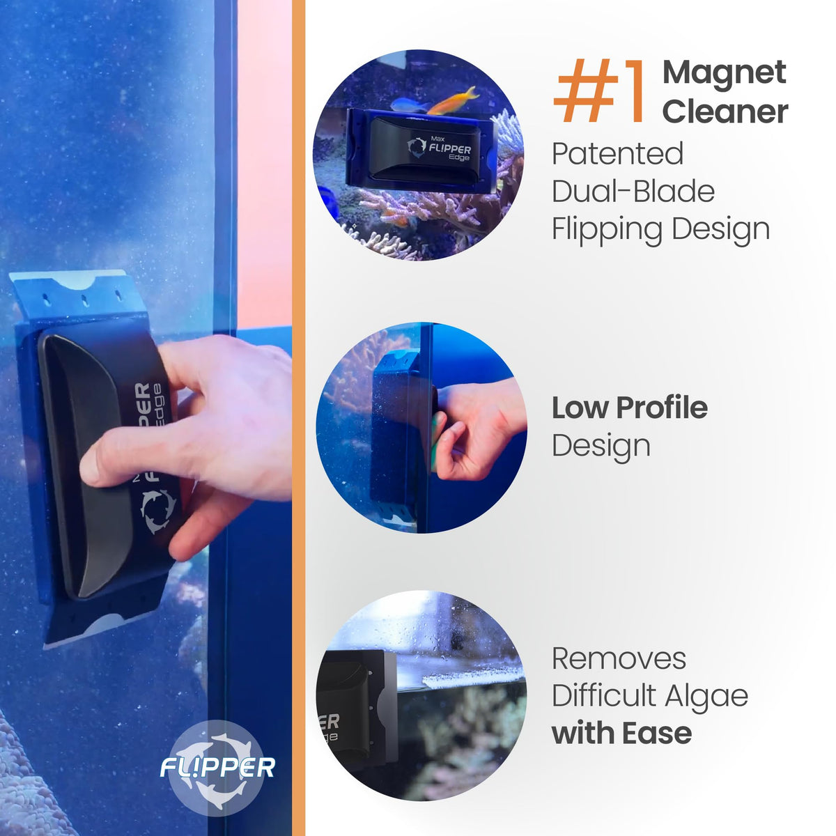 Give Yourself The Edge Max - The Most Advanced Handheld Aquarium Cleaner Ever Made! Float. Fl!P. Scrub. & Scrape. Now With Twice The Cleaning Power! Fl!Pper Aquarium Products' Patented 2-In-1 Magnetic Aquarium Cleaner, Now With Dual Blades, Fl!Ps From Scrubber To Scraper Simply By Rotating Its Handle. Complete Aquarium Cleaning Without Ever Getting Your Hands Wet! A ''Must-Have'' Cleaning Tool For Advanced Aquarium Hobbyists And Maintenance Professionals! Designed For Glass And Acrylic Tanks Up To 1'' (24Mm) Thick Flipper Edge (Standard) Features: - New Dual Blade Design For More Efficient Cleaning! - Interchangeable Stainless Steel And Plastic Blades For Stubborn Algae Removal And Safer Scraping Near Silicone. - New 316 Stainless Steel Blade Has A More Precise Edge Design For Flawless Scraping. - Reversible Blades Give You Twice The Normal Blade Life! - New Acrylic Safe Plastic Blades With The Option To Use A Flat Or Serrated Edge. - Includes (2) Stainless Steel & (2) Acrylic Safe Plastic Blades. - Custom Cut Your Own Blades Using Old Gift / Credit Cards. - Floats To The Surface If The Cleaner Ever Becomes Disconnected. - Ergonomic Grip/Flip Handle For Easy Fl!Pping From Scrubber To Scraper. - Made With Rare Earth Magnets For Incredible Cleaning Strength And Durability. - Cleans Even The Most Stubborn Coralline Algae.
