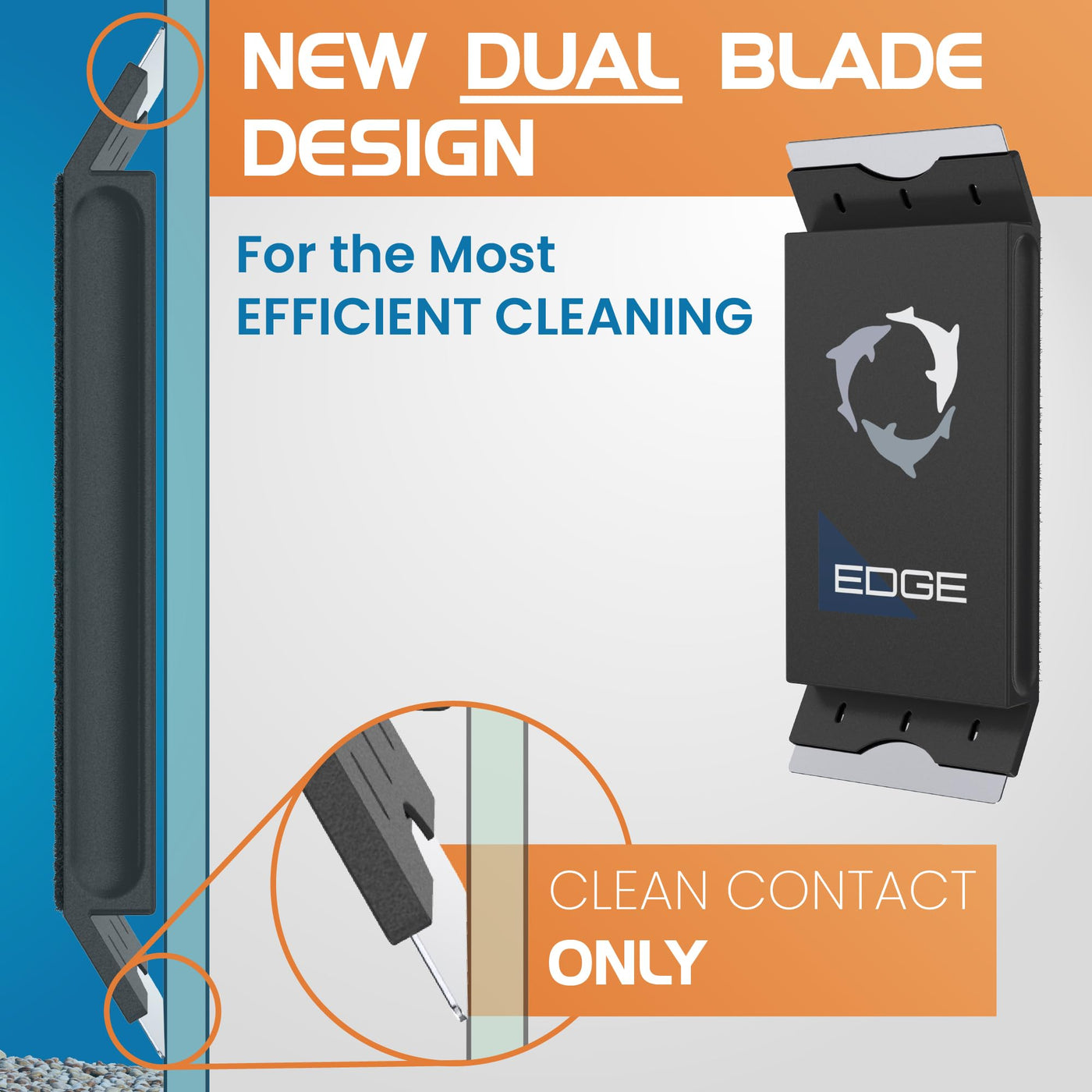 Q: How does the dual blade system work on the Flipper EDGE cleaner?A: The dual blade system allows you to easily switch between scrubbing and scraping by simply rotating the handle. This feature provides twice the cleaning power, effectively removing stubborn algae without the need to put your hands in the water.