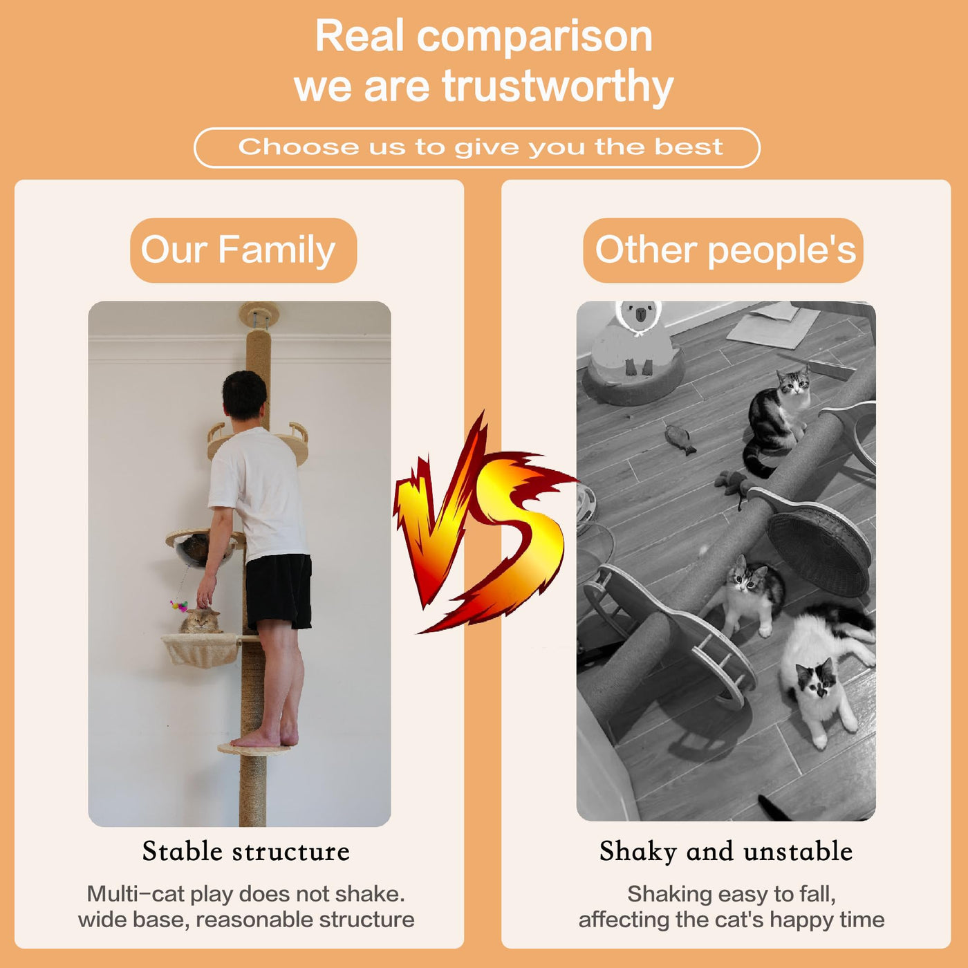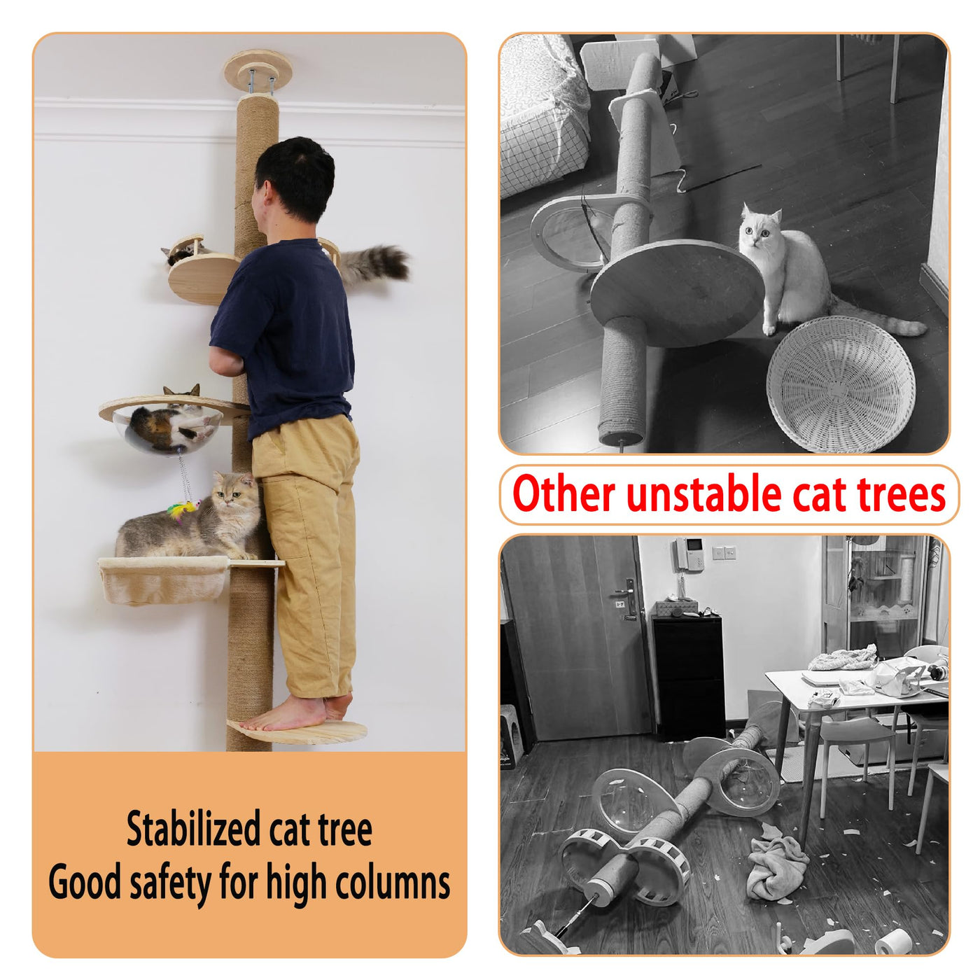 This is an indoor cat tree for most homes, the floor to ceiling cat tree is adjustable 55-118 inches in height to fit every corner of your home. It does not take up a lot of space and only takes up a little room when installing it. Cat tower material: solid wood panels + sisal uprights (12 cm diameter of the uprights, the uprights are made of polyvinyl chloride material inside), 3 supports at the top to make the cat tower more stable, the overall weight is 33 lbs Real material