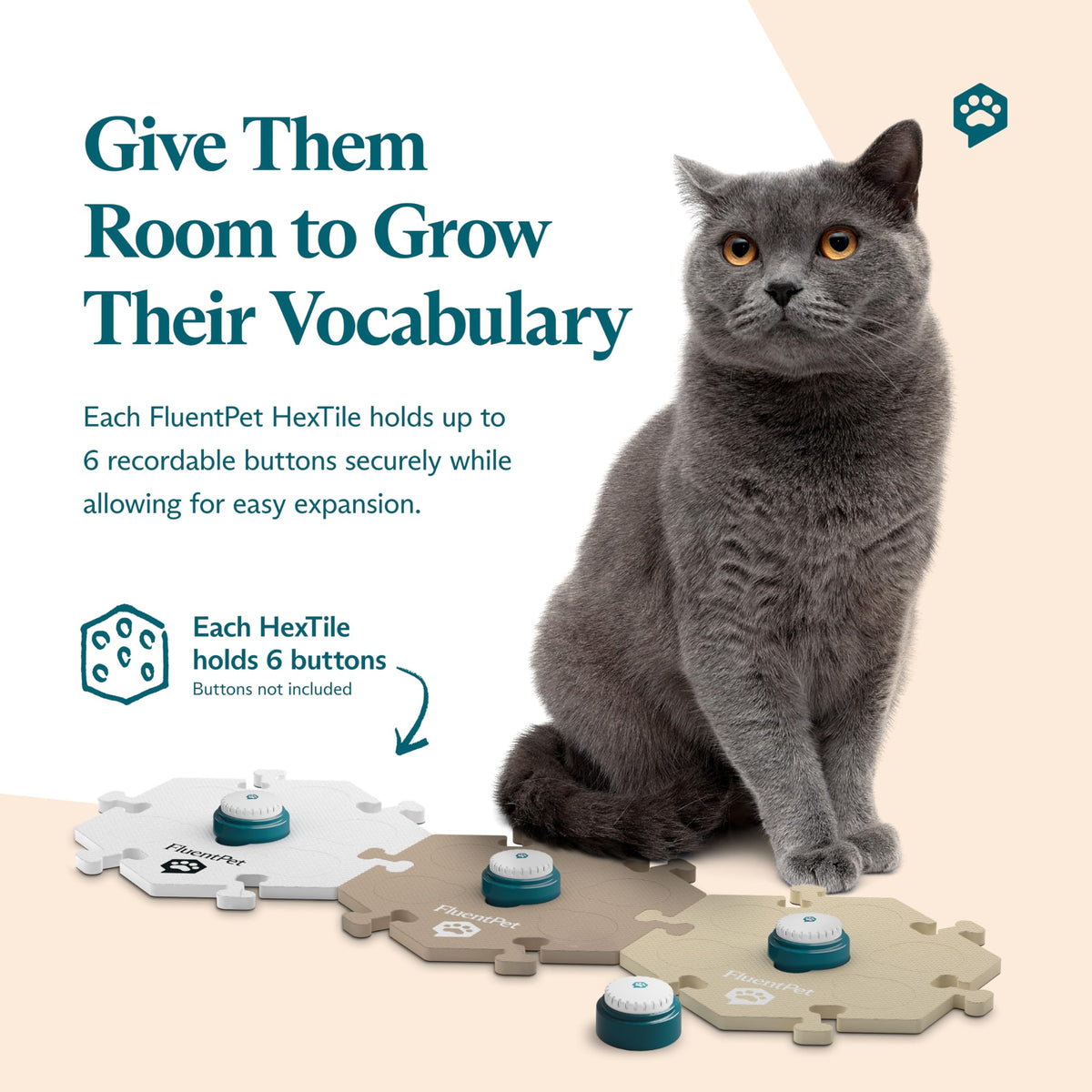 * Increase Pet Vocabulary: Fluentpet Compact Hextiles Are 7.9-Inch Interlocking Tiles Designed To Securely Hold 6 Fluentpet Talking Dog And Cat Buttons. * Fit More In Smaller Space: Our Compact Hextiles Take Up Minimal Space At Only 7.9 In (200 Mm) In Diameter And Fit Snugly Together In Any Configuration You Choose. * Bold Colors: Make It Easy For Pets To Associate Words With The Right Learning Categories. Our Tiles Come In Distinctly Different Colors That Are Easy To Tell Apart. * Durable & Non-Slip: Our Quality, Soft-Top Mats Are Easy On The Paws. Theyre Also Durable, Non-Slip, And Easy To Set Up. * Expandable System: Our Hextiles Have Puzzle Piece Connectors That Enable You To Expand Your Soundboard As Their Vocabulary Grows