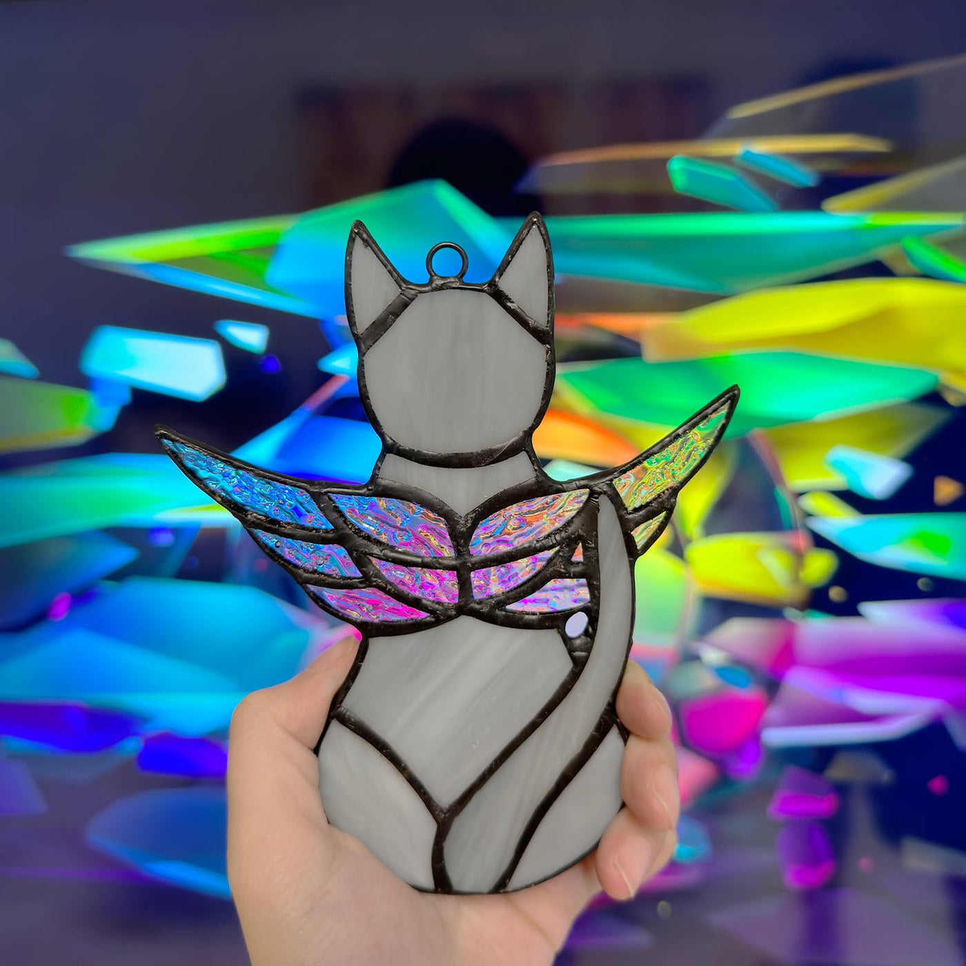 Fluffycaptain Handcrafted Stained Glass Grey Angel Cat Suncatcher - Pet Memorial Gift With Colorful Wings, Cat Lovers Sympathy G