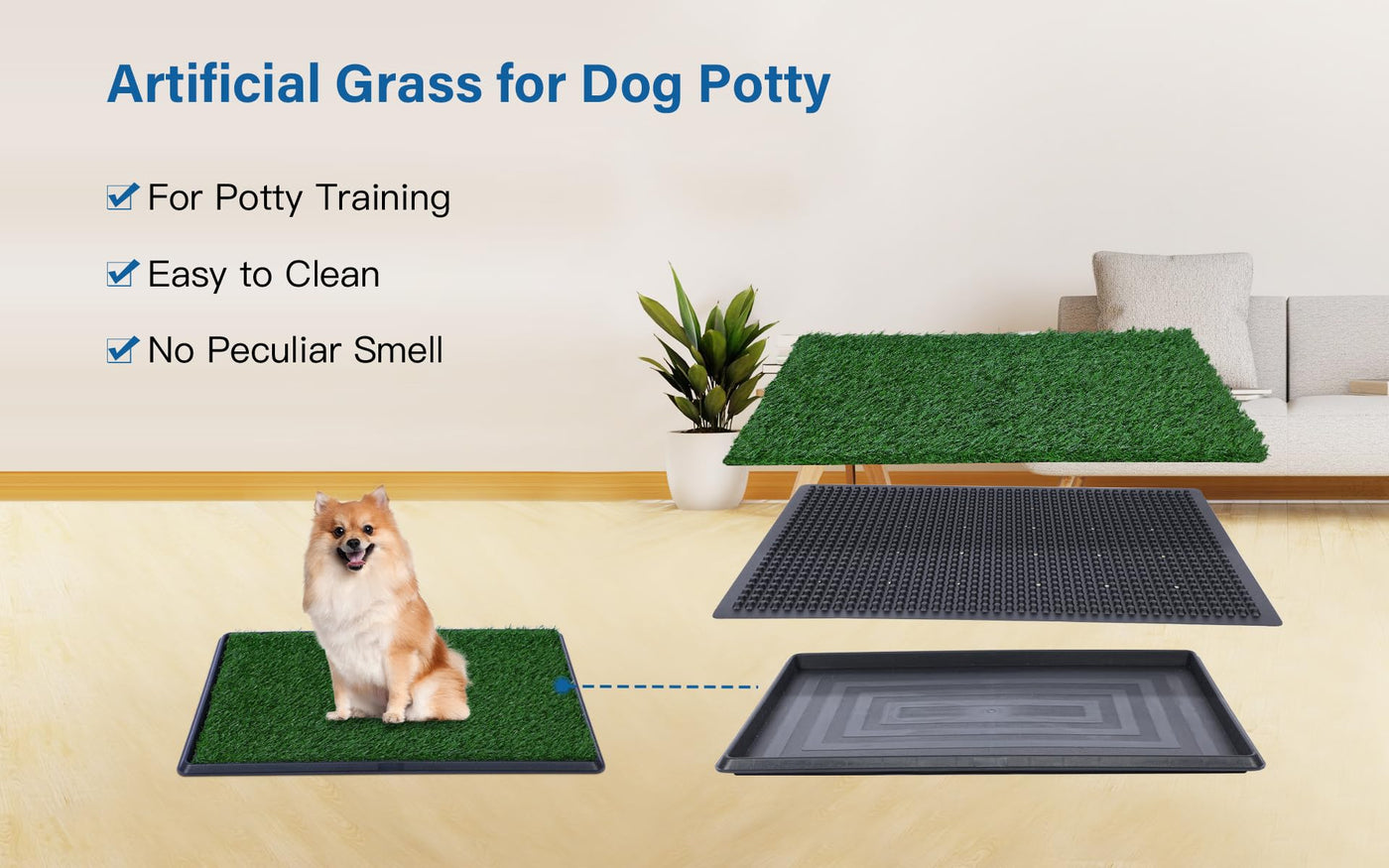 Anti-leak & Mess-free: 3-layer dog potty tray with 1 x grass pad 1 x drainage grate and 1 x base tray. Permeable washable leakproof and extra absorbent.