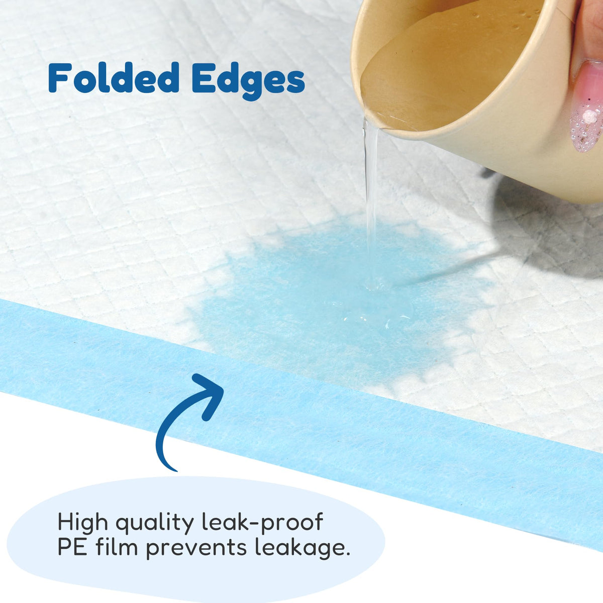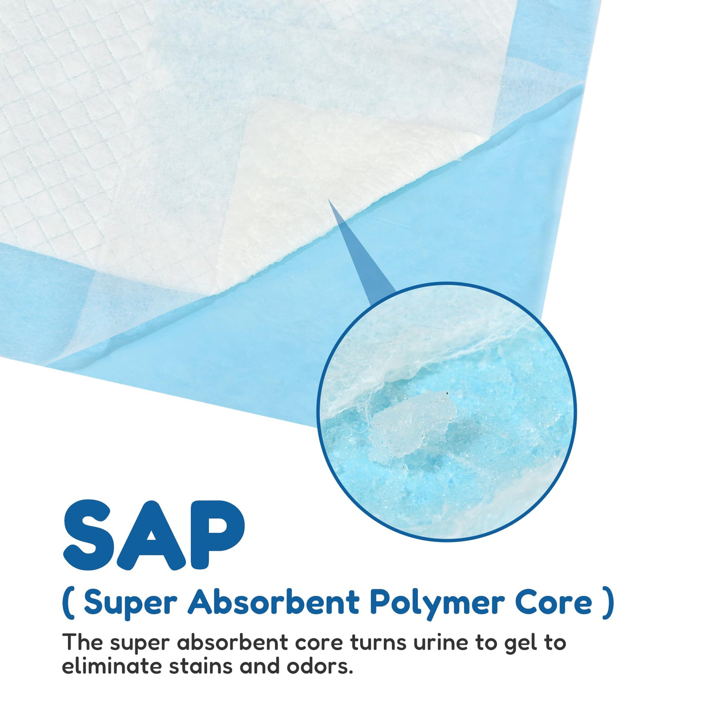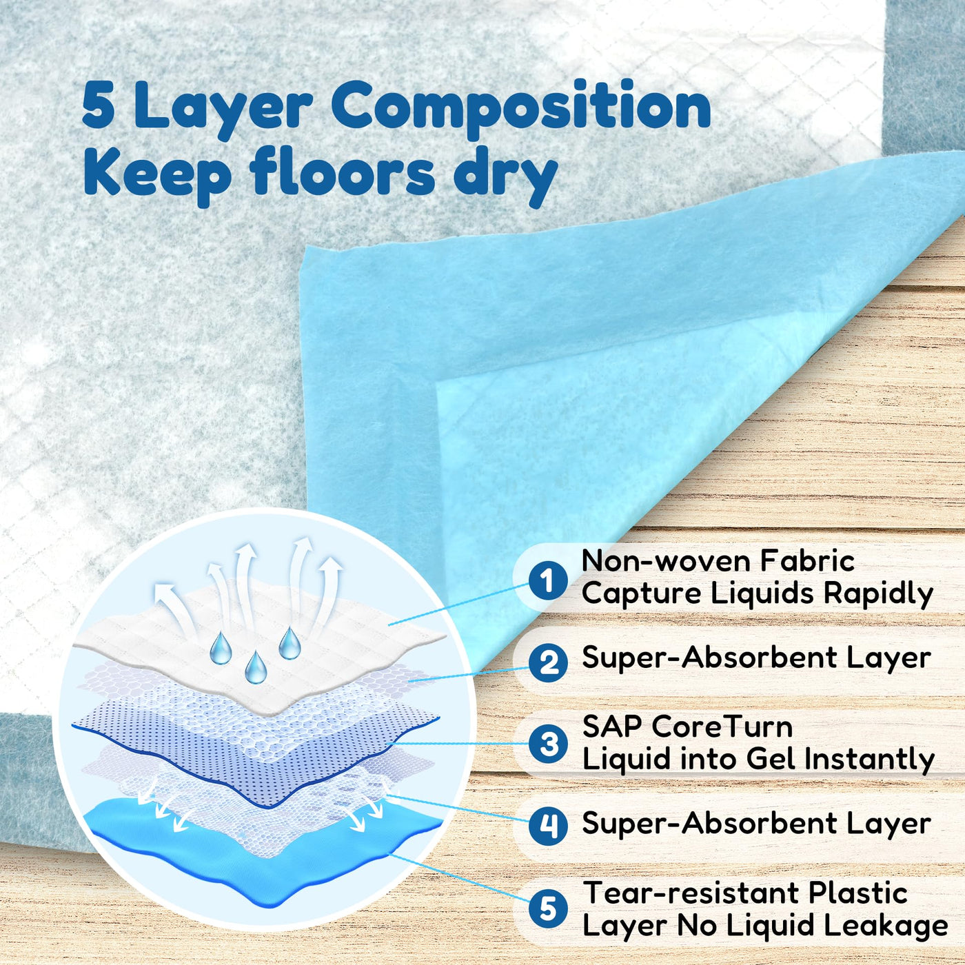 [PRODUCT SIZE] Product measures 17.7 x 23.6 Inches (Length x Width), this Small-Size training pad is suitable from small puppies to medium dogs. Includes 50 pads per pack. | [5-LAYER CONSTRUCTION] Our training pads are made with 5 layers: non-woven cloth as the first layer to allow urine to flow through; the second and the fourth layers are made from paper tissue to add absorbency; the third layer is also the core layer is made from Super Absorbent polymer, and the back layer is a water-proof plastic protecting layer. | [QUICK ABSORBENT & LEAK PROOF] With a super-absorbent core that can lock in moisture by instantly absorbing and turning liquid into gel, each training pad can hold up to 3 cups of water. This product also featured with plastic back and border to prevent any leaking. | [BUILT-IN ATTRACTANT] With a built-in attractant that helps direct your dog to the pad, which could help you achieve a successful housebreaking. This training pad not only can absorb odor and pet urine, but also help protect your expensive hardwood and carpet. | [MULTI-APPLICATION] This product can be used for house-training puppies or assisting senior dogs, this product can be placed at home when you are outside, or in dog crates when traveling.