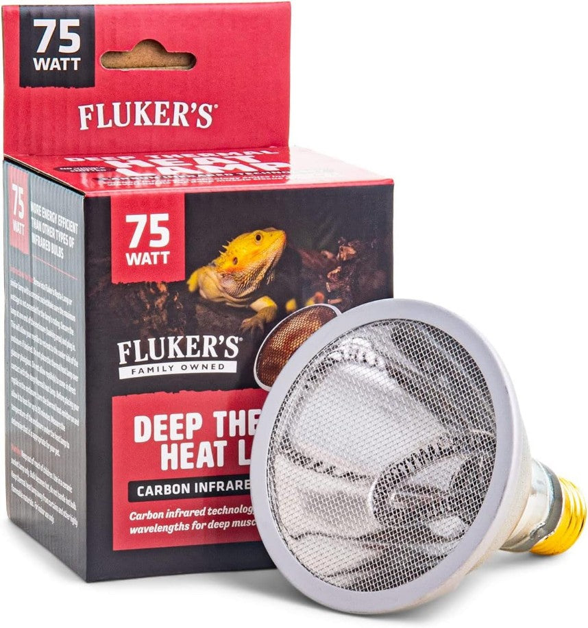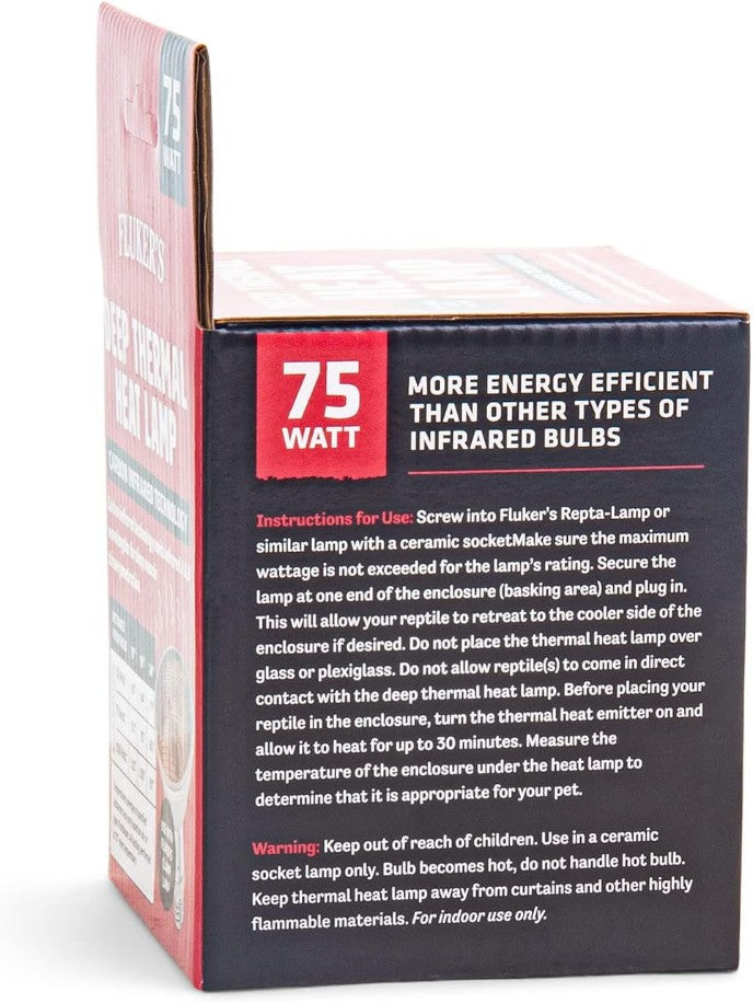 Introducing Flukers Infrared Deep Thermal Heat Lamp Bulbs, the perfect solution to keep your reptile pets warm and healthy. As ectotherms, or cold-blooded animals, reptiles depend on the surrounding environmental temperature to regulate their own body temperatures. If the temperature is not appropriate, your pet may be susceptible to digestive problems or infections. Flukers Infrared Deep Thermal Heat Lamp Bulbs feature an advanced carbon fiber filament that emits both Infrared A and Infrared B, providing deep muscle tissue penetration that mimics natural suns heat. The infrared medium wave energy is easily absorbed by the reptile, which gently increases the temperature of their skin. The advanced Infrared Deep Thermal Heat Bulb offers 24/7 heat with minimal visible light and zero UV emission, so it wont disturb the sleep of reptiles or pets. The heating speed is fast and stable, and the heat is balanced and lasting, making it the perfect heat lamp for any style of terrarium. The parabolic reflector focuses heatwaves for optimal basking conditions, making it the perfect solution to maintain the humidity in your enclosure and prevent dehydration, as they do not evaporate water as quickly as standard heating lamps. These bulbs are manufactured with precision, resulting in higher quality and long-lasting durability. The carbon fiber filament ensures constant heat emission, while the heavy-duty construction guarantees higher durability and longevity. To ensure proper use, refer to the convenient temperature guide on the packaging. Keep your pets warm and healthy with Flukers Infrared Deep Thermal Heat Lamp Bulbs!Offers 24/7 heat with minimal visible lightParabolic reflector focuses heatwaves for optimal basking conditionsLong-lasting durabilityFast and stable heating speedZero UV emission makes it perfect for all types of terrariums
