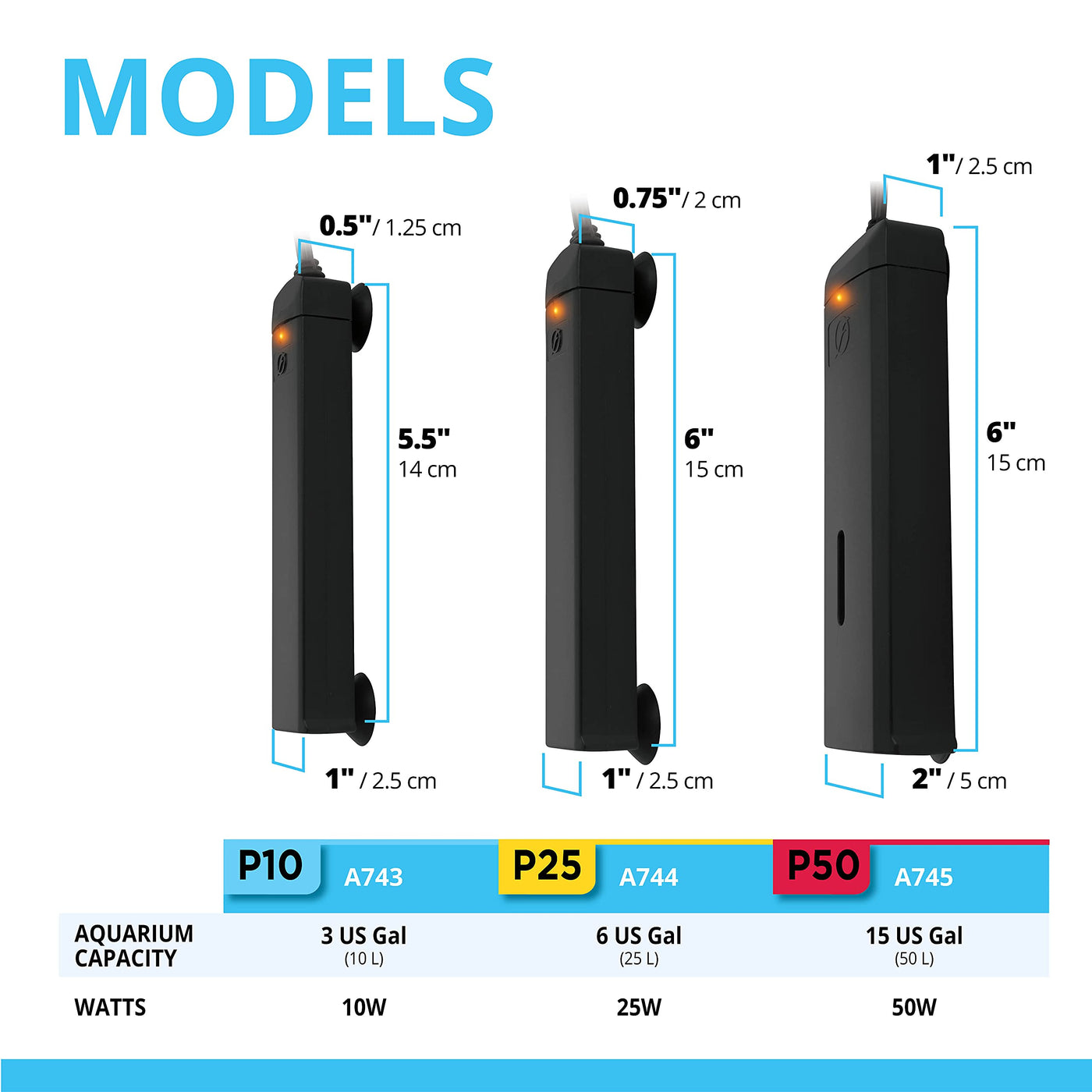 Designed for aquariums up to 15 US Gal (50 L), the Fluval P50 heater is fully submersible and offers a safe shatterproof polymer construction. It is equally convenient, featuring a pre-set temperature and LED running lamp.For more fish tank accessories, check out other Fluval products including aquarium filters, filter media, aquarium heaters, aquarium air pumps, aquarium lights, aquarium rocks, aquarium thermometers, and aquarium stands. Fluval has a wide variety of products that are perfect for your pet fish to enjoy in any large fish tank, small fish tank, saltwater tank or freshwater tank. Fluval first broke onto the aquatic scene in 1975 by introducing the world’s first 3-stage filter with synchronous motor technology – a landmark breakthrough that is still applied in the industry today. Since then, Fluval has built a legacy around this pioneering spirit, relentlessly adapting in a changing world to launch innovative aquarium products that remain at the forefront of technology, and which set the bar in quality, style and functionality. Fluval’s mission is not just about building products that mimic the natural world, but inspiring aquarists of all skill levels to enjoy and respect the hobby for generations to come.