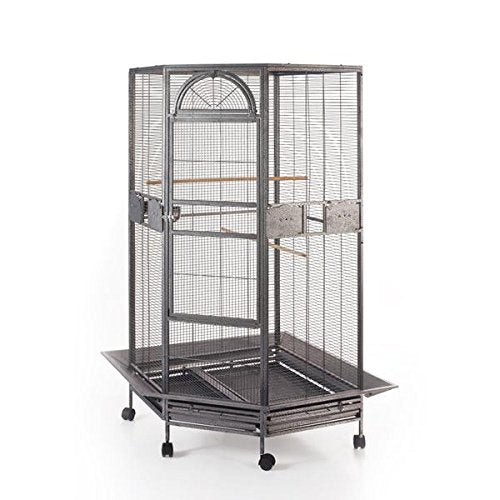 Features: Space Saving corner design Large access door makes placing and removing your bird an easy task! Top opens to create a accessible play top Slide out grates for easy cleaning, keeps your bird safe inside. Sliding out removable tray for easy cleaning and waste removal. 2 Large wood perches. 4 Swing feeder gates with feeder bowls 360 degree surround seed skirt Cage features vertical and horizontal bars for your birds climbing pleasure. Powder coating finish, free from Zinc and Lead toxicants. Castors for easy moving about. Specification: Bar Spacing: 5/8 Bar Gauge: 1/8 Finish: Powder coating finish, safe from toxins harmful to birds Dimensions: H63.5 x 30 x 30(without seed skirt) Door size: H32 x W15.5 Included Accessories: Slide out tray: 2 Slide out grate: 2 Feeder Doors: 4 Feeder Cups: 4 Access doors: 1 Perches: 1 Ideal for: Budgies, Parakeets, Cockatiels, Lories, Love Birds, Parrotlets, Conures, Pionus, Senegals, Jenday and any similarly sized small to medium birds.