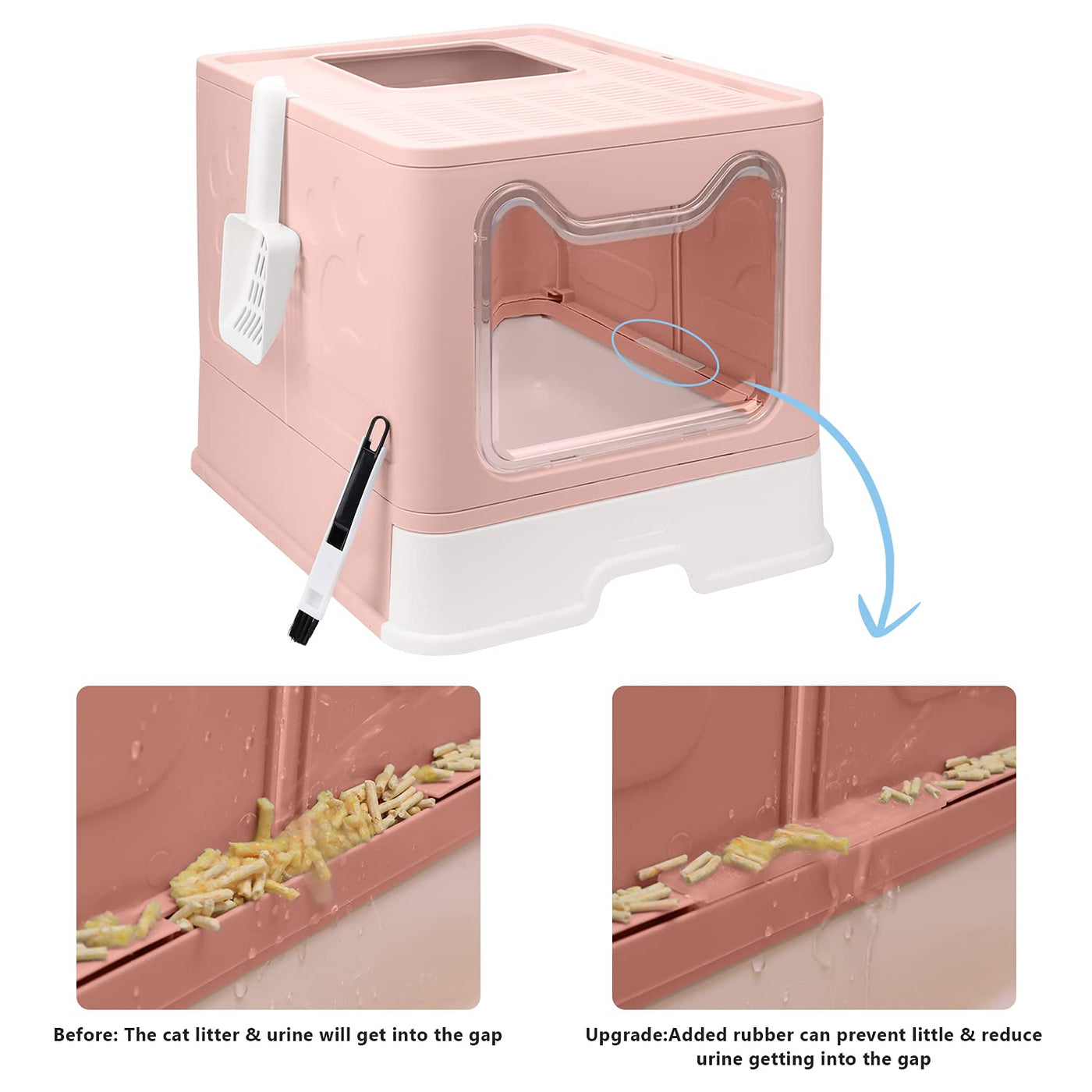Foldable Cat Litter Box With Lid, Enclosed Cat Potty, Top Entry Anti-Splashing Cat Toilet, Easy To Clean Including Cat Litter Scoop And 2-1 Cleaning Brush (Pink), Large