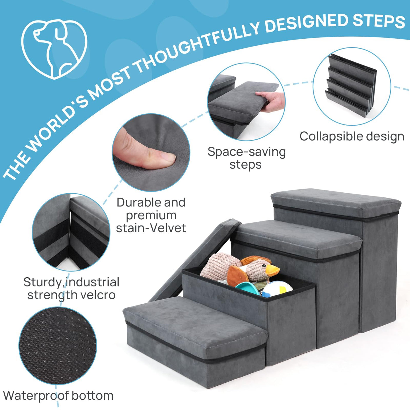 Practical Storage Function: The couch's dog steps are large-capacity storage space. The top cover can be easily opened for easy storage of pet supplies, portable and easy to use, saving space. | Superior Quality Material: The dog stairs are made of soft skin-friendly plush fabric, which is more wear-resistant than ordinary fabric stairs. The surface texture has resistance to stepping on and is not easy to slip. It can better protect the pet's foot joints and reduce the leg burden. | Safe Design: The dog stairs are designed with a flat slope, so that small dogs and elderly pets can easily climb the stairs. Steps can provide stable footing. It is excellent for small medium dogs and cats, making it easy for older, arthritic, or small pets to reach high beds, chairs, couches, cars, or other spaces they hard to reach. | Easy Assembly and Portable: You can put the foldable dog steps for a high bed together in 10 seconds. Lightweight and sturdy, these pet stairs can be easily moved, shifted, and stored for convenient accessibility. Pet steps fold flat so you can easily store them under your couch or bed. | Health and Environmental Protection Material: The internal density board of the dog stairs meets the furniture quality inspection standards, and the formaldehyde-free board structure makes the steps more stable and can be used with peace of mind.