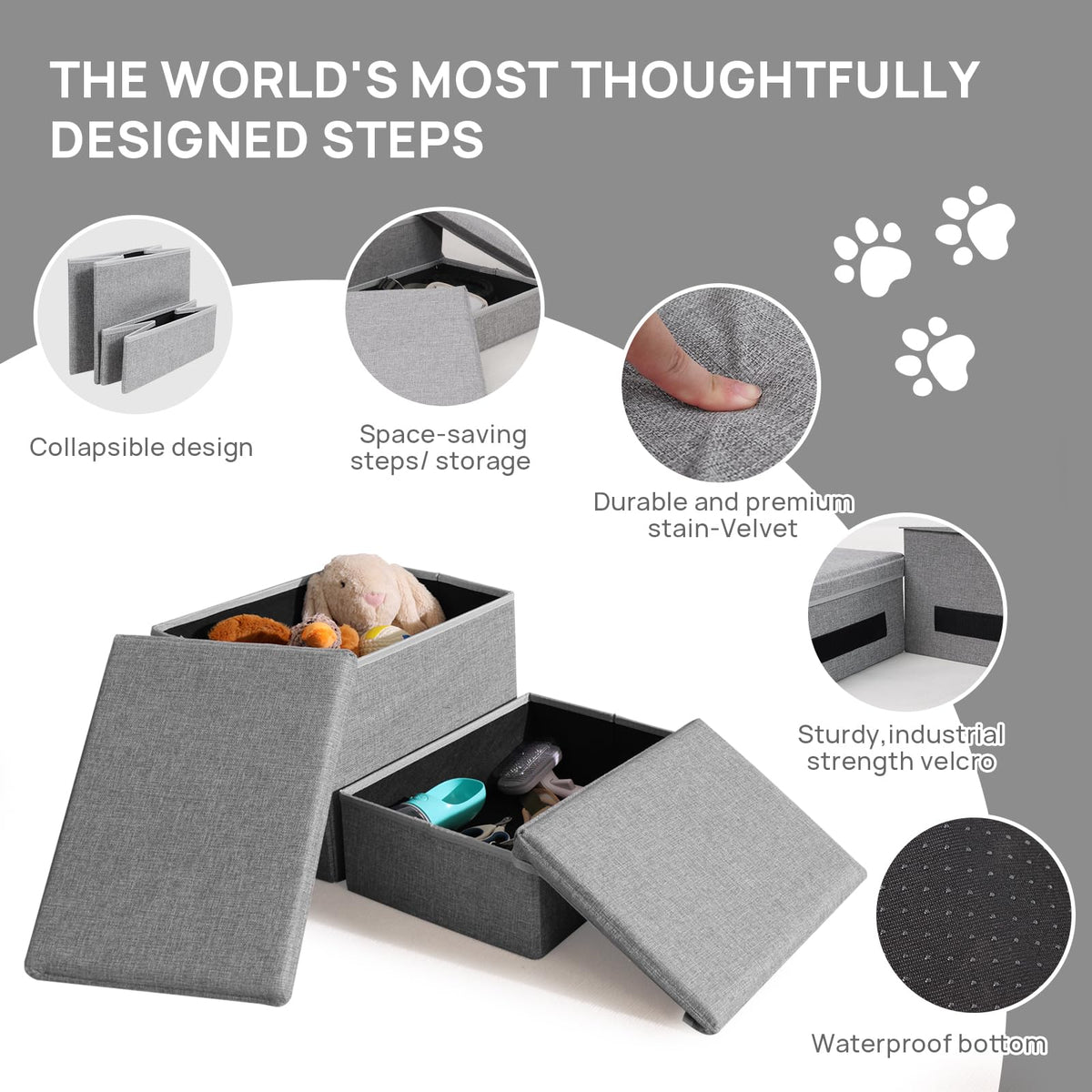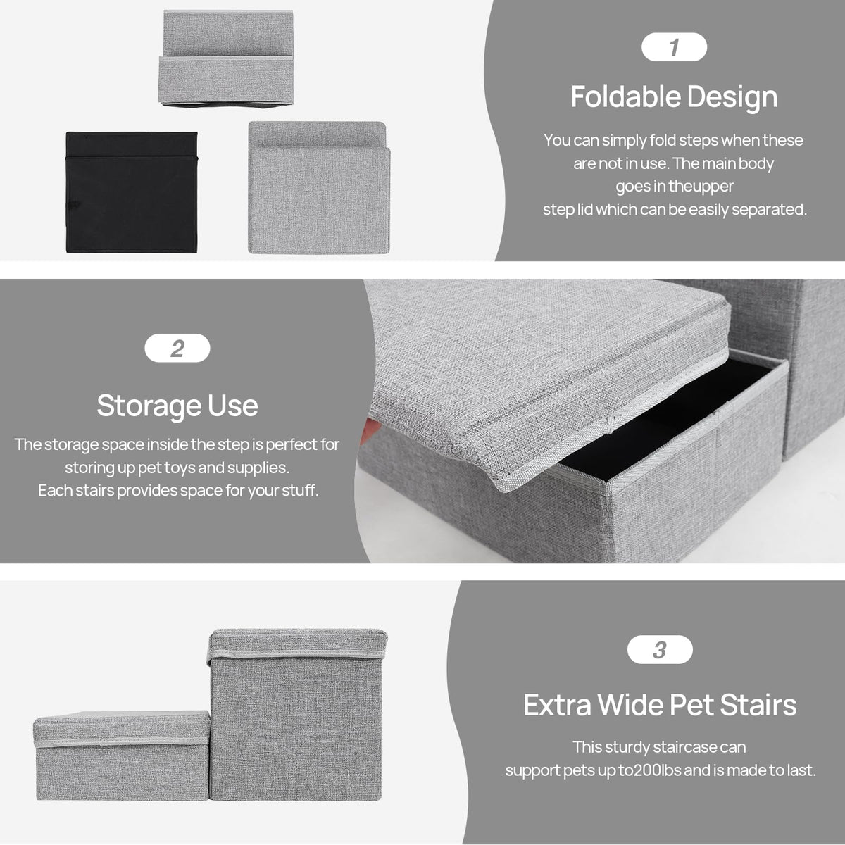 Practical Storage Function: The couch's dog steps are large-capacity storage space. The top cover can be easily opened for easy storage of pet supplies, portable and easy to use, saving space. | Superior Quality Material: The dog stairs are made of soft skin-friendly plush fabric, which is more wear-resistant than ordinary fabric stairs. The surface texture has resistance to stepping on and is not easy to slip. It can better protect the pet's foot joints and reduce the leg burden. | Safe Design: The dog stairs are designed with a flat slope, so that small dogs and elderly pets can easily climb the stairs. Steps can provide stable footing. It is excellent for small medium dogs and cats, making it easy for older, arthritic, or small pets to reach high beds, chairs, couches, cars, or other spaces they hard to reach. | Easy Assembly and Portable: You can put the foldable dog steps for a high bed together in 10 seconds. Lightweight and sturdy, these pet stairs can be easily moved, shifted, and stored for convenient accessibility. Pet steps fold flat so you can easily store them under your couch or bed. | Health and Environmental Protection Material: The internal density board of the dog stairs meets the furniture quality inspection standards, and the formaldehyde-free board structure makes the steps more stable and can be used with peace of mind.