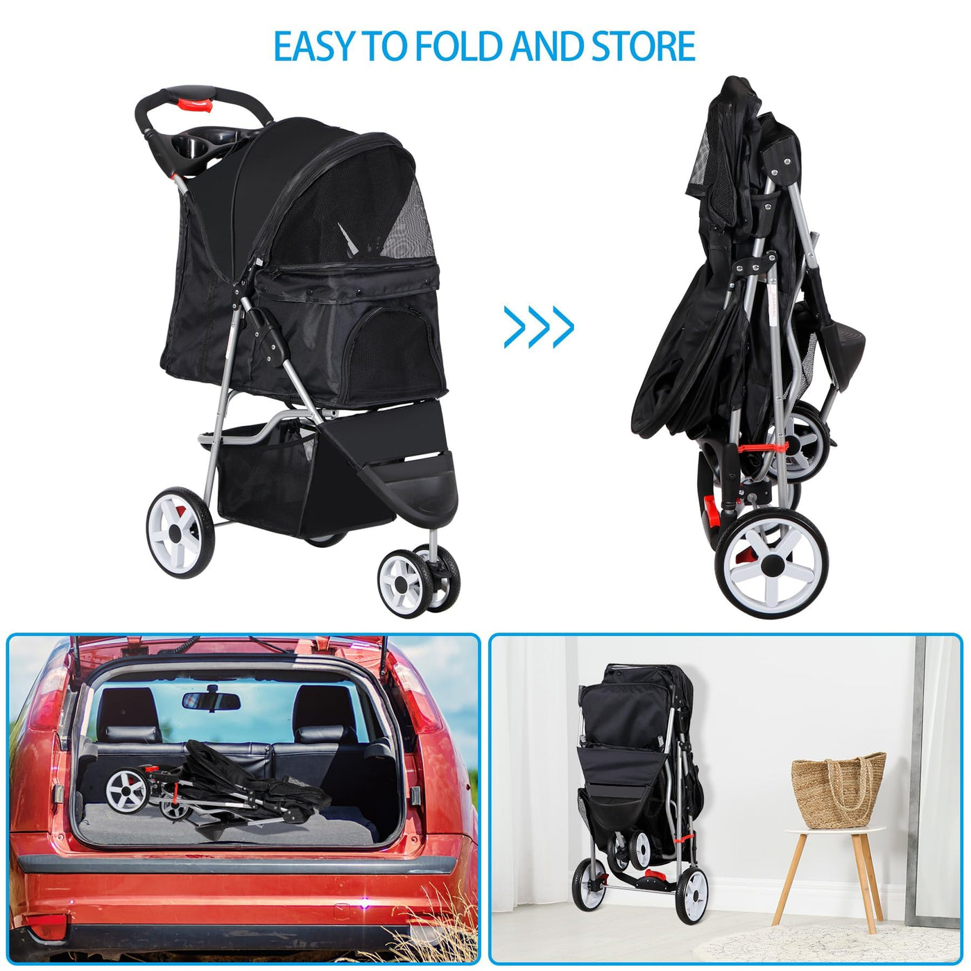 Foldable Pet Stroller For Cats And Dogs 3 Wheels Carrier Strolling Cart With Weather Cover, Storage Basket + Cup Holder (Black)