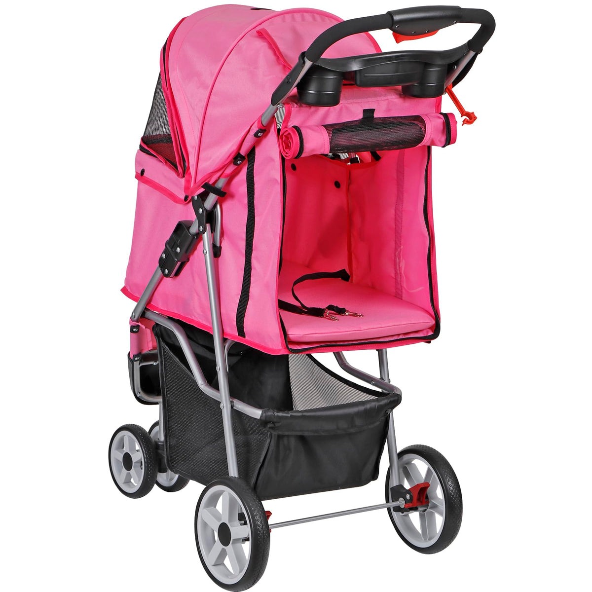 Kitties And Pups Are People'S Best Friends. How Pleasant Taking Along Your Furry Friend On Long Walks Or Jogs And Enjoying Charming Scenery On A Sunny Afternoon! This Pet Stroller Is The Best Way For Keeping Your Lovely Pet With You In All Your Adventures - Travel In The Park, Walk Around The Block, Even Shopping At The Mall!Features: Waterproof Oxford Cloth With Padded Bottom Is Comfortable. Breathable Mesh Cover Provide Ventilation And Great Viewing. Front And Back Zipper Access Will Be Easier For You To Put Your Pet In And Out. Constructed Of Stainless Steel Tubes Durable Enough To Last Years Of Use. The Front Wheel Is Equipped With A Shock Absorber, Which Can Absorb Shock And The Impact Of The Road, So That The Pet Stroller Can Run Smoothly And Make Your Lovely Pet More Comfortable Inside. The Rear Two Wheels Have Brakes For Safer Use.Folds Up Into Compact Size For Convenient Storage And Save Space. Dual Cup Holders And Center Tray For Small Items. There Is A Seat Belt Inside The Pet Stroller To Protect The Pet.Specifications: Color: Pink Material: Oxford + Stainless Steel Item Size: 30.7''L X 17.7''W X 40''H Back Window: 13.19''X 16.73'' Top Window: 11.02'' X 7.87'' Inside Size: 21.3'' X 13'' X 20.9'' Bottom Storage: 9.8'' X 11.4'' X (7-11)'' Distance Between Handle: 12.6'' Weight Capacity: 33Lbs