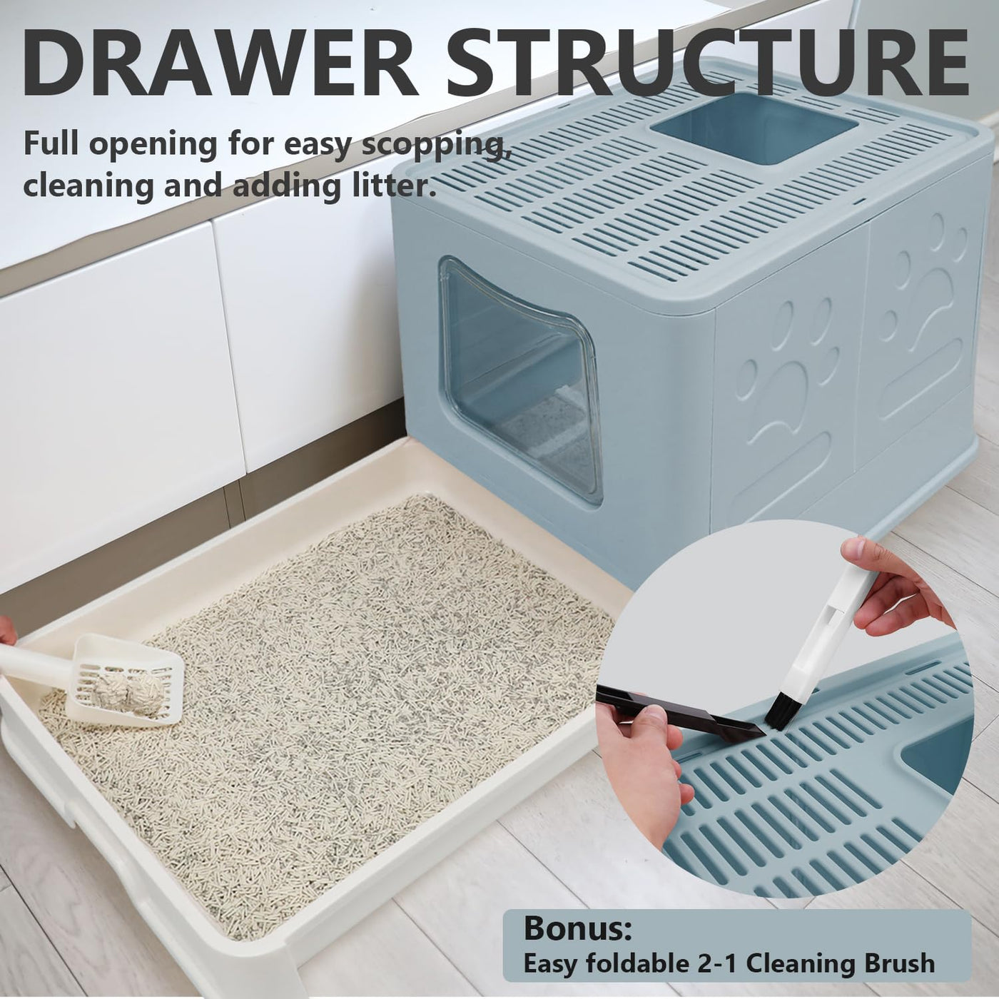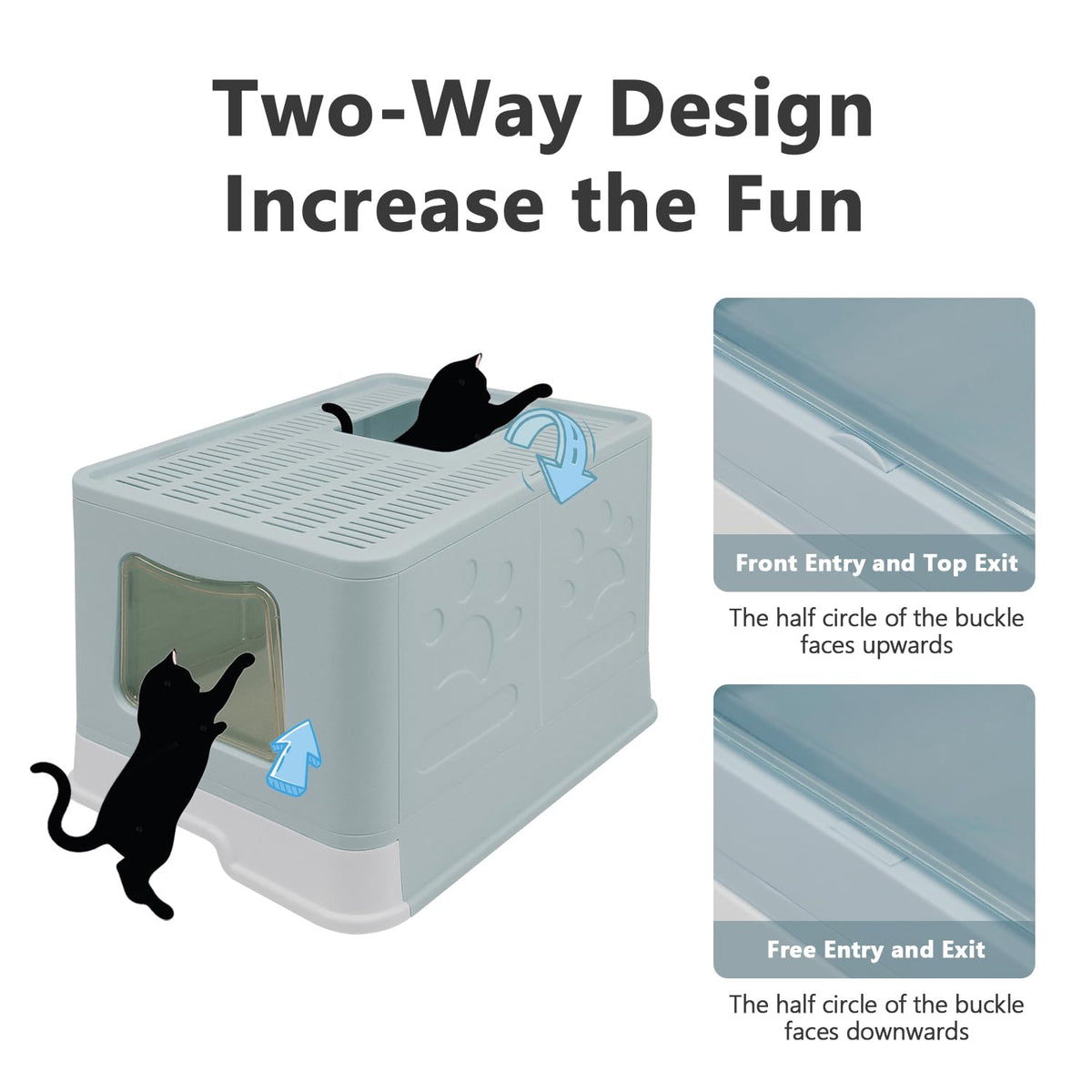 Folding and Portable]- The collapsible design of cat litter box is convenient for storage install and disassemble The space-saving and portability are the biggest advantages You can use it whenever and wherever your cats need it Ideal for travelling unique Design]- One-way design Front Entry and Top Exit the self-closing front entrance just go in not out The top entry door can enter and exit at will and train the cats natural beating and increase the fun The large-area hollow out Falling sand pedal It protects the cats paws shake off the cat litter during the jump no need to worry about cats getting cat litter everywhere Easy-cleaning]- The pull-out drawer design can easy to shovel and exchange sand Easy for cleaning the cat litter with minimal mess Equipped with the matching cat litter scoop and 2-1 cleaning brush Large private space]- cat toilet with large internal space which is convenient for cats to enter and exit and turn around The completely enclosed structure protects cats privacy which will make them feel safer and more comfortable It reduces the odor emission in the house and keep the air fresh Eco-friendly Material]- High-quality PS and PP materials are applied to ensure the safety of pets