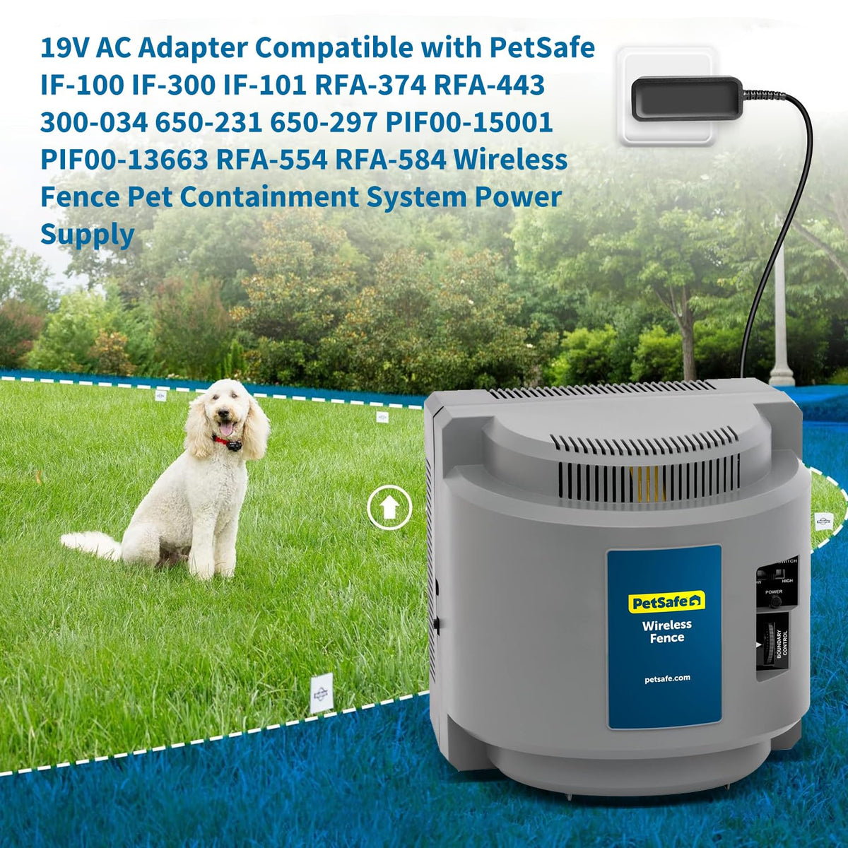 ?Compatibility ?Compatible with: PetSafe IF-100 PIF-300 MOD: 300-034 RFA-443 IF-101 IF100 PIF300 300034 PIF00-15001 PIF00-15002 PIF00-13663 PIF-275 PIF-275-19 RFA-374 RFA443 RFA-554 RFA-584 RFA-14 RFA-67 RFA-67-11 IF101 Wireless Dog Pet Containment System Fence Transmitter Receivers Radio Systems Corporation SPS-06C19-1W-US-BR 650-231 SPS-06C19-1W-E P/N: 650-297 Raplacement for PetSafe Power Cord.