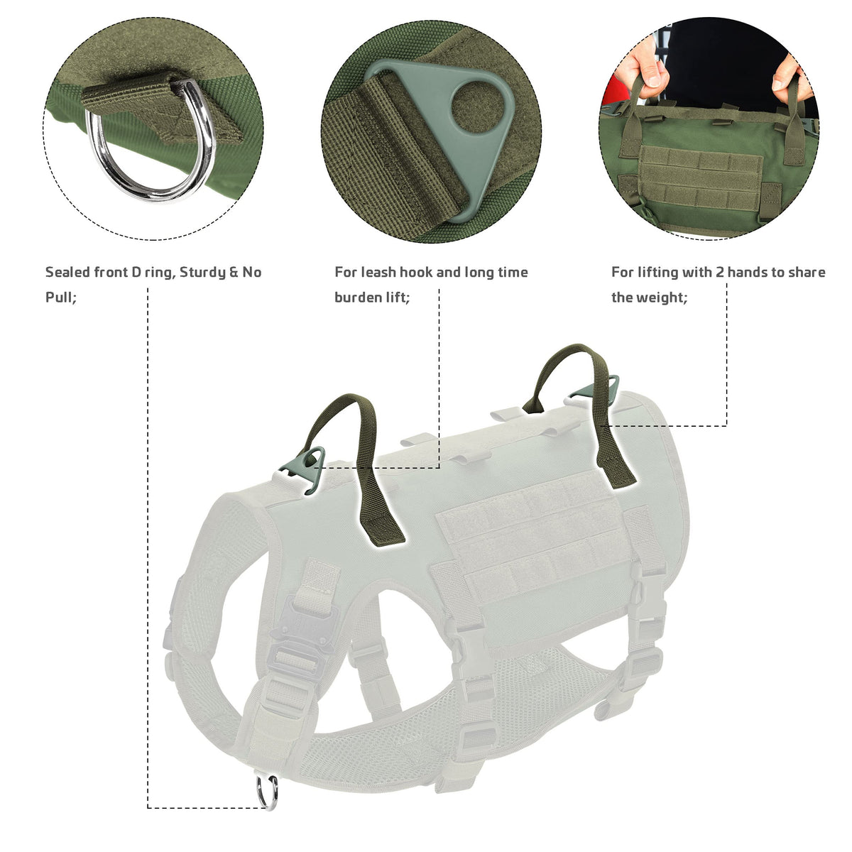 Q: Is the tactical dog harness suitable for heavy pullers?A: Yes, the harness is designed for heavy pullers. It features two strong metal buckles that each bear up to 1000 lbs, ensuring a secure fit and control. The design includes reinforced stitching and a sturdy construction to withstand the forces exerted by strong dogs.