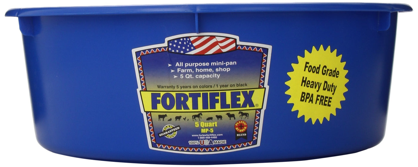 Q: What is the capacity of the Fortiflex Mini Feed Pan?A: The Fortiflex Mini Feed Pan has a capacity of 5 quarts, making it ideal for feeding and watering larger dogs and horses.