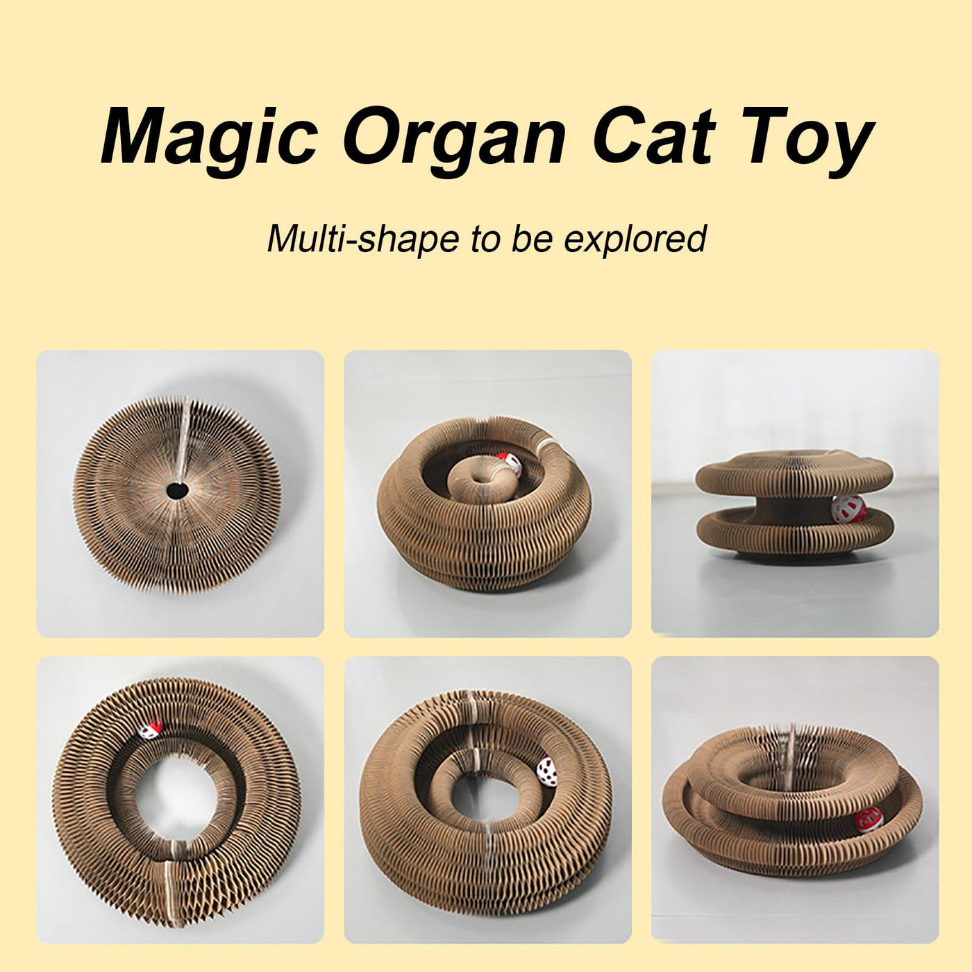 [Magic Organ Cat Toy]: The cat scratcher can be changed to different shape with the bell ball inside like a magic organ and we packed the catnip in the package you can put them in the board your cats will definitely love to play with it to release energy and get well exercised