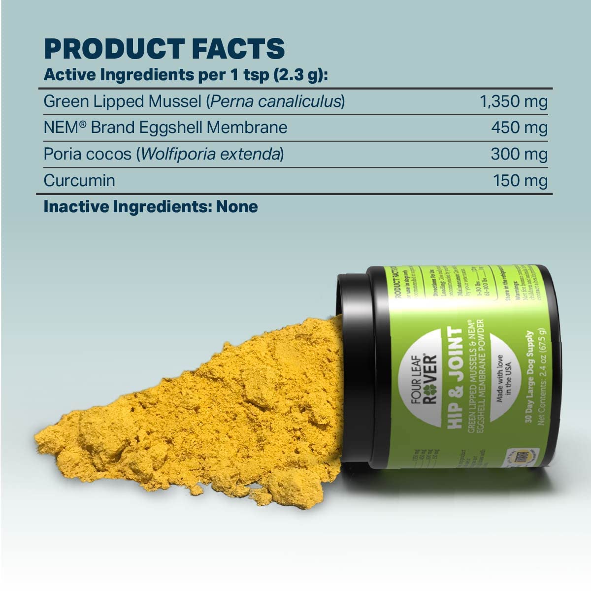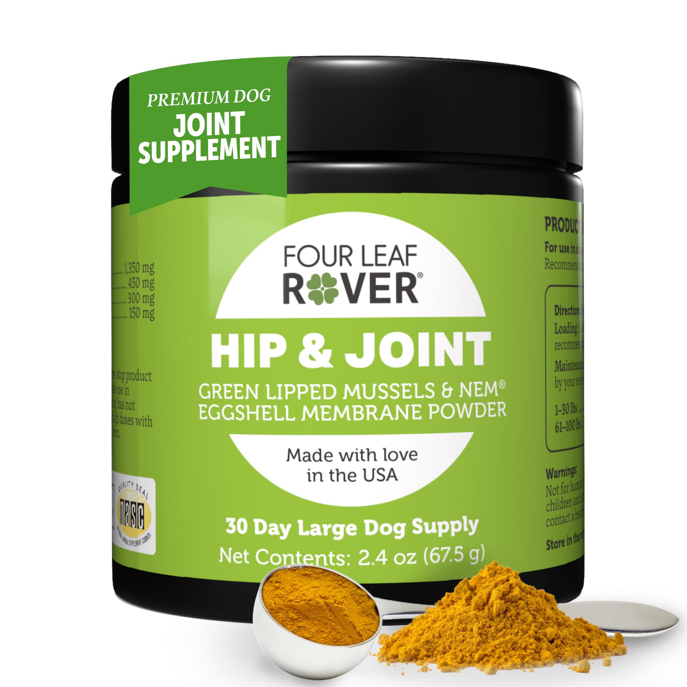Introducing Four Leaf Rovers premium Dog Joint Support Supplement, the ultimate solution for maintaining your dogs joint health and mobility. Specially formulated by veterinarians, our advanced formula combines the power of turmeric powder for dogs, eggshell membrane, and green lipped mussels to provide comprehensive joint support. Whether you have a small breed or a large breed, our joint supplement for dogs is designed to cater to all sizes and needs. Turmeric powder, known for its potent anti-inflammatory properties, is a key ingredient in our blend. The active compound in turmeric, curcumin, works effectively to reduce inflammation and pain, making it an essential component of the best joint supplement for dogs. Additionally, our inclusion of eggshell membrane offers a natural source of glucosamine, chondroitin, and collagen, essential elements for maintaining healthy joints and connective tissues. Green lipped mussels for dogs are another vital ingredient in our supplement. Sourced sustainably, these mussels are packed with omega-3 fatty acids, which are known to support joint health and reduce stiffness. This makes our product one of the most comprehensive joint supplements for large dogs and small breeds alike. Four Leaf Rovers joint supplement for dogs is made in the US, ensuring the highest quality and safety standards. Our formula is free from any artificial fillers, preservatives, or harmful chemicals, providing a natural and effective solution for your dogs joint health. Key Features: - Veterinarian formulated for optimal joint health - Contains turmeric for dogs, eggshell membrane, and green lipped mussels - Natural source of glucosamine for joint support - Suitable for all breeds, including large dog joint supplement - Made in the US with high-quality, natural ingredients