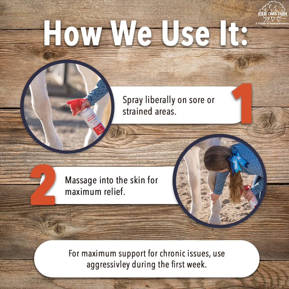 Get Straight to the Ache: Natural Release Muscle Relaxant Spray works in minutes to help reduce equine muscle and joint stress, arthritis, tendonitis, discomfort, bruising and inflammation. Can be used before or after physical exercise - we recommend both. | Easy to Use: All natural Horse Liniment combines transdermal Dead Sea magnesium, arnica, and eucalyptus to provide immediate relief. Spray liberally on sore or strained areas and massage into skin. For lingering strains, reapply after 15 minutes and then every 3-4 hours. | Natural & Non-Toxic: Does not contain menthol or other heat-inducing ingredients, so it can safely be used under saddles, wraps or therapeutic blankets. Non-oily and alcohol, filler, and scent-free. All ingredients in Natural Release are considered GRAS by the FDA. | Multiple Size Options: Available in 3 spray sizes and a gel form. We recommend using the 8 oz blue spray bottle for indoor, personal use and the larger bottles for barn use. Also great for on the go use with athlete horses. | Made in the USA: Trusted in hundreds of stores across the country, all Four Oaks Farm Products are made in Simi Valley, CA. We stand firmly behind our products, and our customer service team is ready to exceed your expectations.