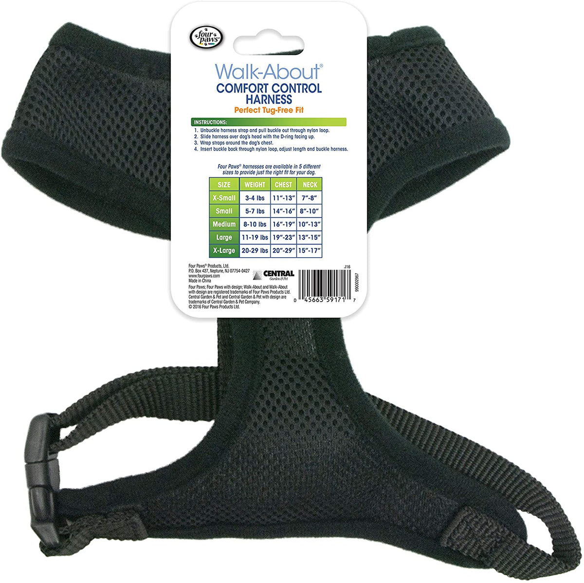 The Four Paws Comfort Control Harness Is Comfortable For Dogs To Wear With Complete Control For The Owner. The Four Paws Comfort Control Harness Is Durable, Made Of Long Lasting Neoprene Mesh Material That Is Very Light Weight And Breathable For Comfort.Comfortable For Dogs With Complete Control For Youlong-Lasting, Durable Neoprene Meshadjustable Nylon Straps For A Secure Fitthe Four Paws Comfort Control Harness Features Adjustable Nylon Straps For A Perfect Fit.Sizing: Measure Dogs Girth Behind Front Legs And Add 2'' For Correct Size.X-Small: Dogs 3-4 Lbs (11''-13'' Chest, 7''-8'' Neck)Small: Dogs 5-7 Lbs (14''-16'' Chest, 8''-10'' Neck)Medium: Dogs 7-10 Lbs (16''-19'' Chest, 10''-13'' Neck)Large: Dogs 11-18 Lbs (19''-23'' Chest, 13''-15'' Neck)X-Large: Dogs 20-29 Lbs (20''-29'' Chest, 15''-17'' Neck)