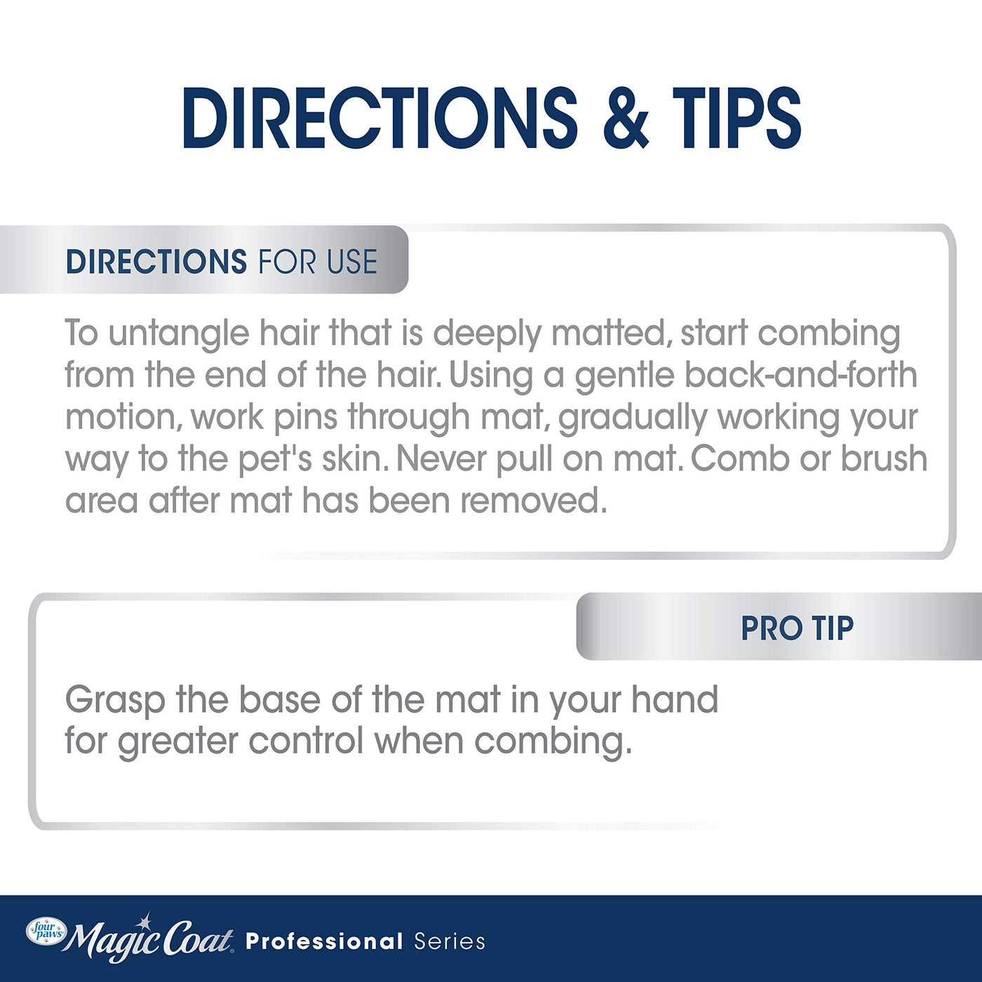 The Magic Coat Professional Series features premium multi-purpose pet grooming tools for a salon-like experience right at home. The Mat Removing Rake Comb is a detangling solution uniquely designed to work through the toughest mats while minimizing pulling. The innovative V-shaped dog dematting comb effectively gets to hard-to-reach areas. Meanwhile, the sturdy stainless steel pins penetrate stubborn mats and the double row of teeth decreases coat damage. Featuring an ergonomic handle, it offers ultimate comfort and control while grooming your best friend. This dog mat remover comb is ideal for medium, long, and curly coats.