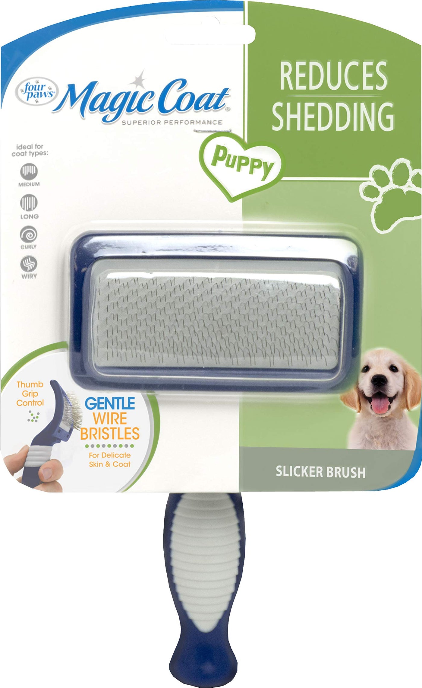 The Magic Coat Professional Series features premium multi-purpose pet grooming tools for a salon-like experience right at home. Specifically designed with thinner bristles for delicate puppy skin, the Puppy Slicker Brush gently lifts and captures excess hair while increasing shine for a lustrous coat. It features a curved head that glides over hard-to-reach areas and flexible bristles that remove loose hair while smoothing the coat. The sturdy ergonomic handle and thumb grip on the small slicker brush offer ultimate comfort and control while grooming your best friend. This puppy brush is ideal for medium, long, curly, and wiry coats.
