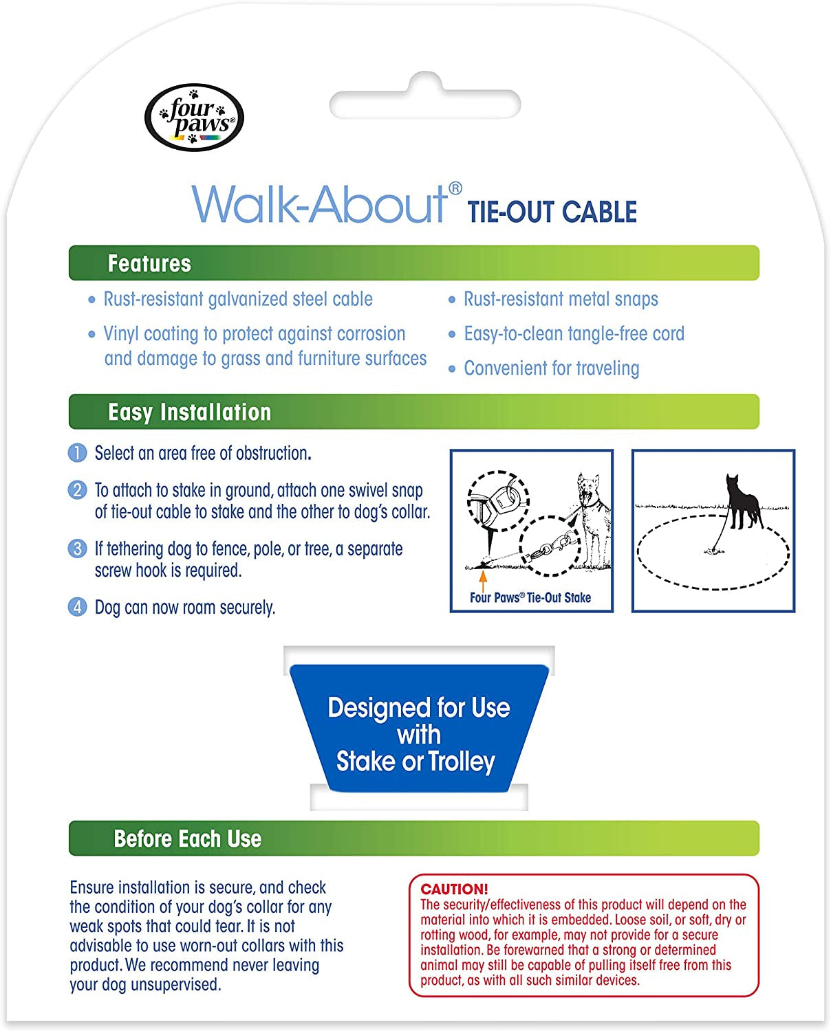 Four Paws Heavy Weight Dog Tie-Out Cables Ensure Pet Safety While Allowing Complete Freedom. These Vinyl Coated Aircraft Cables Are Rust-Proof And Are Available In A Variety Of Lengths. Four Paws Tie-Out Cables Are Strong, Safe And Include Two Bronze Snaps. Tie-Out Cable - Heavy Weight Is For Dogs Over 50 Lbs.Vinyl Coated Aircraft Cablerust-Proof Bronze Snapsallows Freedom And Insures Safety For Dogs