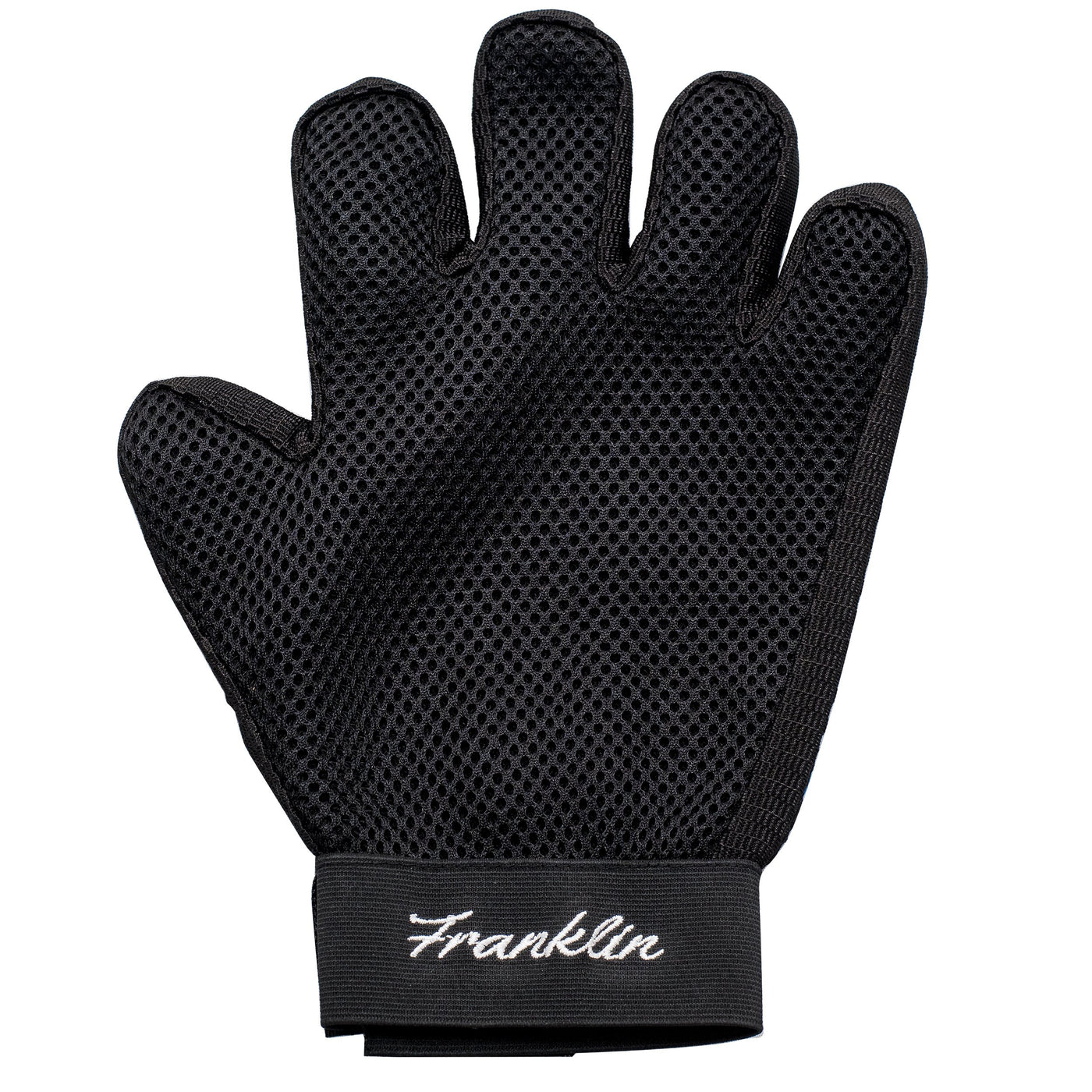Q: How do the Franklin Sports Pet Grooming Gloves work for hair removal?A: The Franklin Sports Pet Grooming Gloves are designed with soft rubber tips that gently remove excess hair, dirt, and dander from your pet's coat. As you groom your pet, the hair sticks to the glove, making it easy to peel off and dispose of.