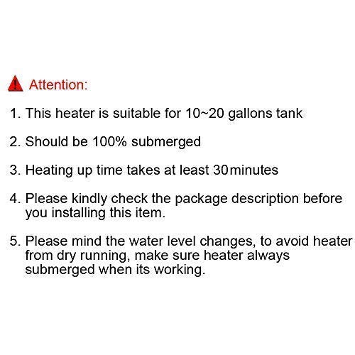 Instructions ●Temperature control switch box should be higher than water surface. ●To get the best performance of heating up the aquarium , when you using this heater we suugest to use a wave maker at the same time to support water circulation. ●Heater should be completely submerged in the circulating water to work properly. ●Heaters can not be exposed above the water, Heaters can not working.