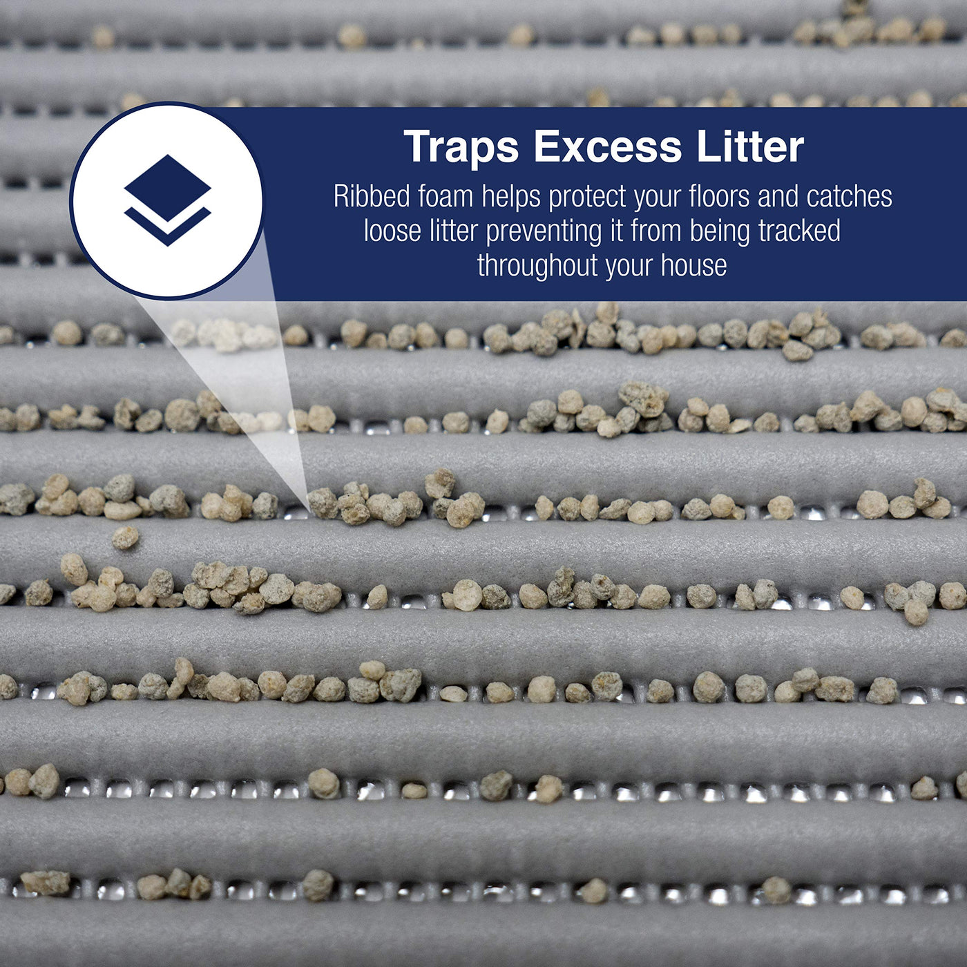Q: What type of material is the litter mat made from?A: The litter mat is made from durable jumbo foam, which is designed to withstand regular use while effectively trapping litter and providing comfort for your pets.