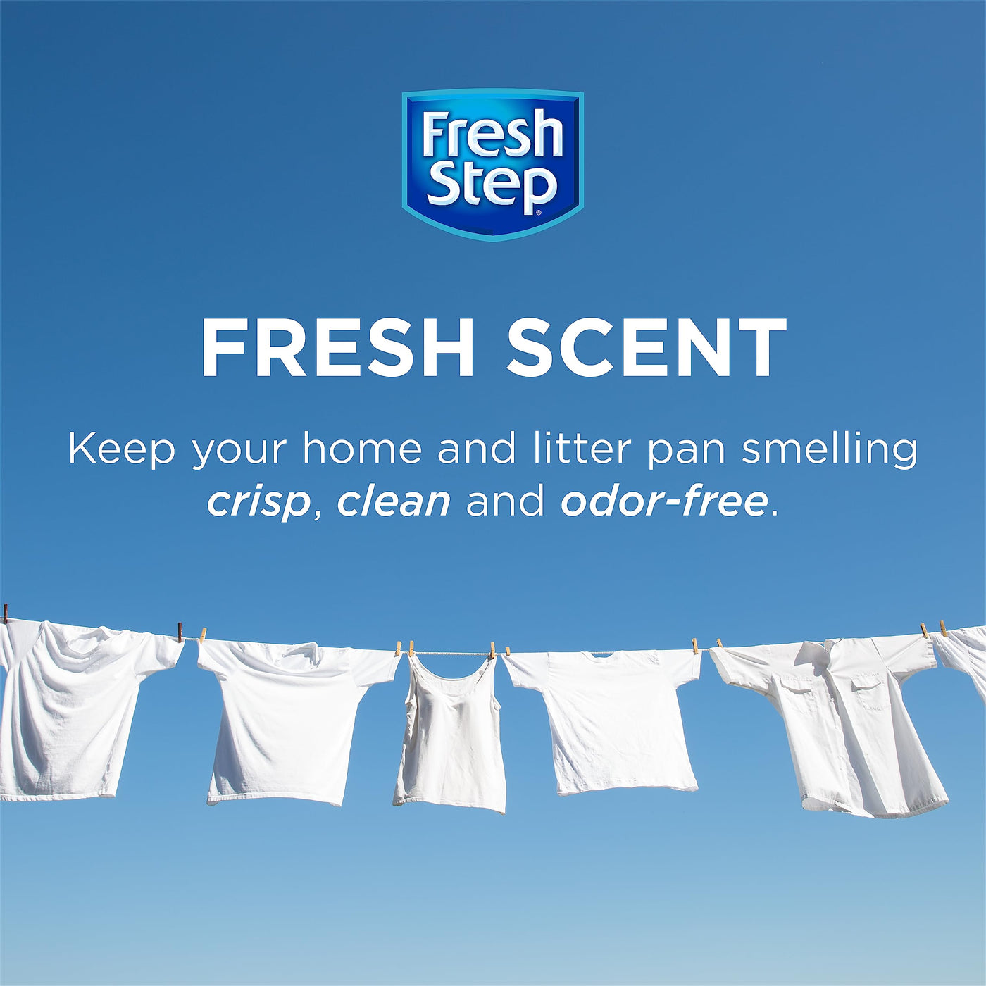 Q: What scent do Fresh Step Cat Litter Crystals have?A: Fresh Step Cat Litter Crystals come in a revitalizing Fresh Scent, which not only helps mask odors but also adds a clean and pleasant fragrance to your cat's litter box area.