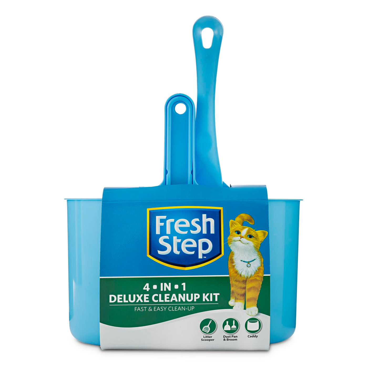 Q: What is included in the Fresh Step 4 in 1 Deluxe Cleanup Kit?A: The Fresh Step 4 in 1 Deluxe Cleanup Kit includes a pooper scooper, dust pan, broom, and caddy, providing all the essential tools you need for effective cat litter box maintenance.