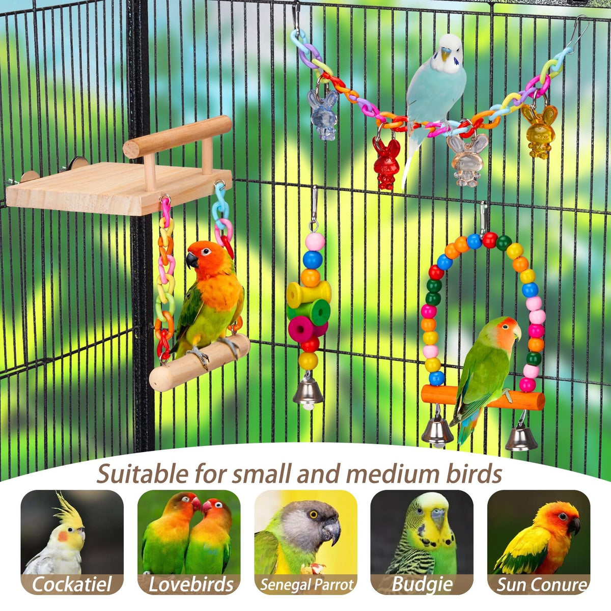 11 Pcs Bird Cage Toy Kit: The Bird Toy Set Includes 10 Parrot Toys And 1 Wooden Bird Perches Platform With Swing, Meeting All The Exercise, Standing, Climbing, Playing, Chewing, And Resting Needs Of Your Bird Or Parrot. Keep Your Pet Bird Engaged And Active.
