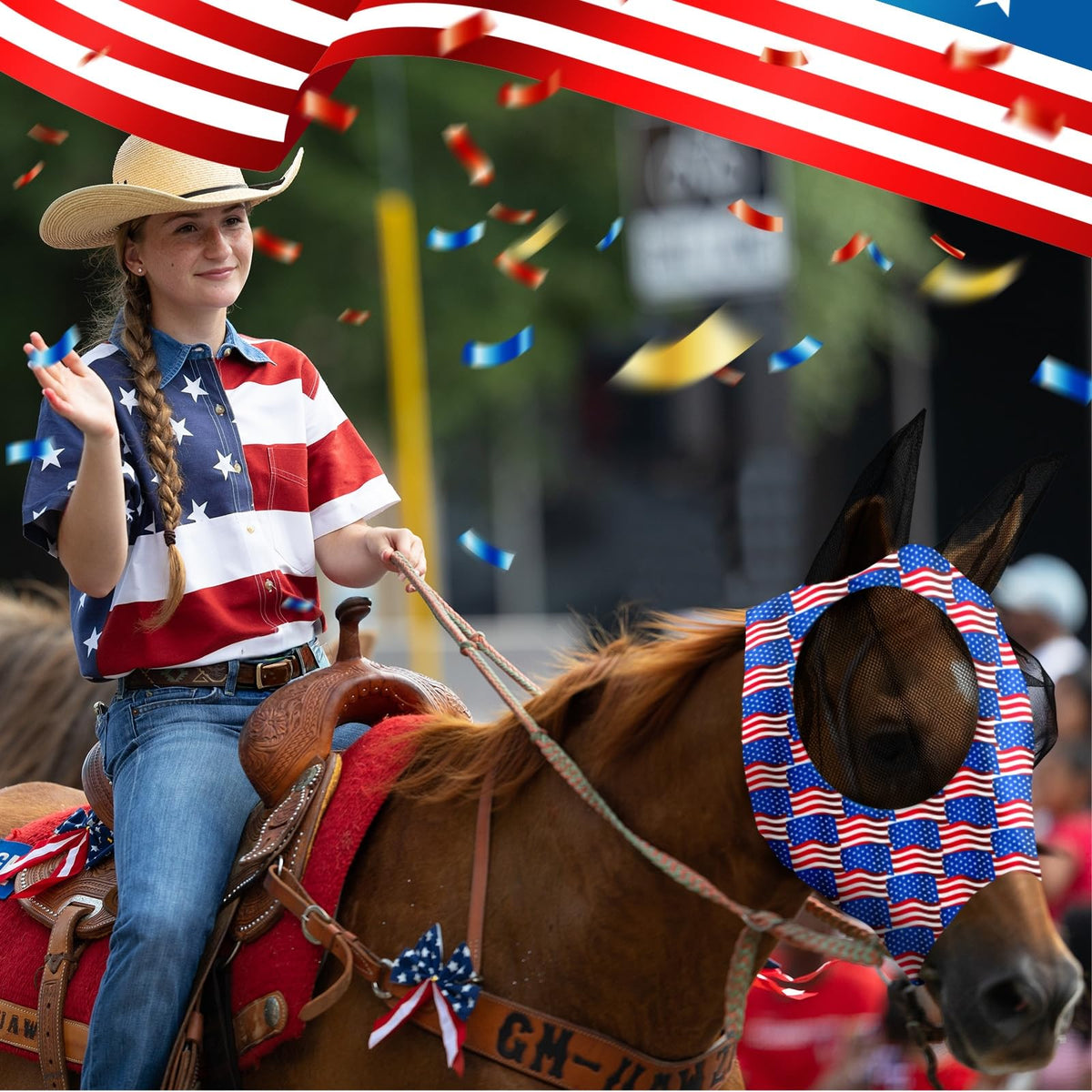 Features: Stylish patterns: These Independence Day fly masks for horses with ears are designed with many Independence Day symbolic elements, including flag, star and so on, in line with the patriotic and memorial theme, your horse will be the focus in the horses Delicate design: The horse fly mask adopts 3D cutting design, and the 3D cut mesh of the eyes can prevent the horses from blinking and bruising, providing your horses with a cozy wearing experience. Specifications: Material: fabric Color: as shown in the pictures Size: large Package includes: 4 x Independence Day horse fly mask Note: Due to manual measurement, please allow slight errors on size. Due to the different monitor and light effect, the actual color may be a little different from the pictures.