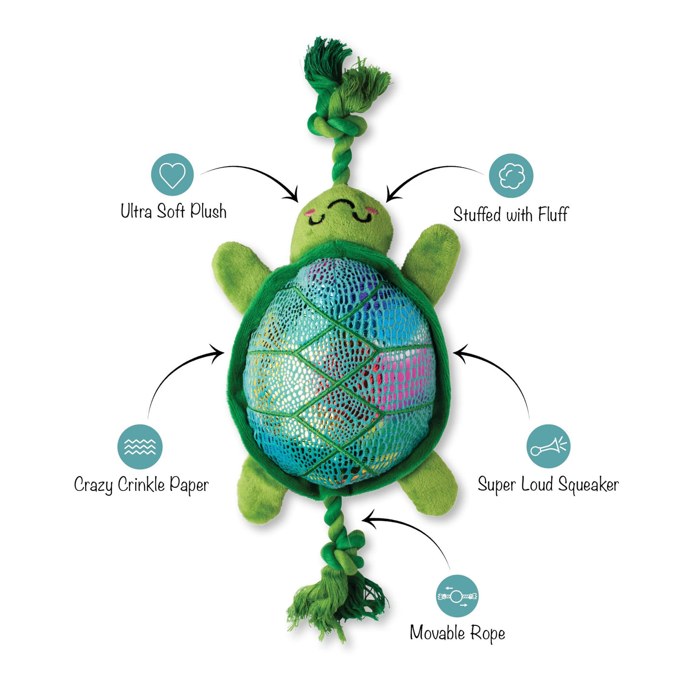So turtle-y cool! PetShop by Fringe Studio's Shello There plush toy is perfect for playtime, anytime. Made with a super loud squeaker, crazy crinkle paper, and tuggable rope with sliding toy function, this toy will help your pup come out of its shell. Great for all-sized dogs and not intended for aggressive chewers.
