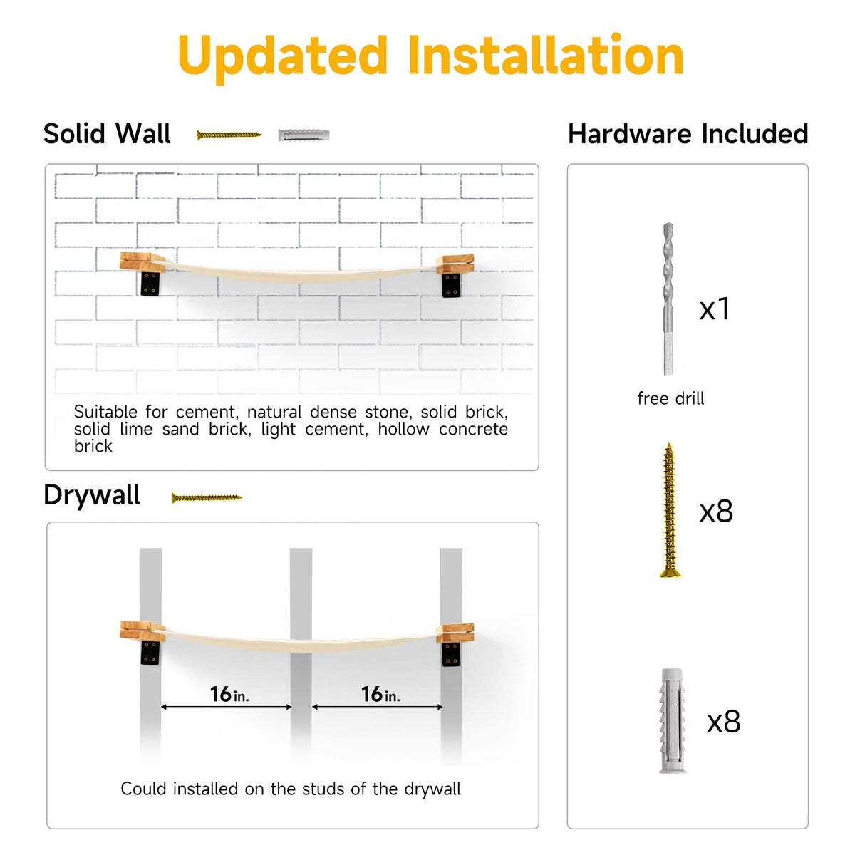 LARgE AND STYLISH cAT WALL SHELF - 34x13 inch our long cat wall shelf gives cats plenty of space to perch upon they can feel free sleeping playing napping running cAT DREAM PLAYgROUND - A stylish new cat furniture this hammock attaches directly to the wall It provides a vertical space for your cat to perch nap and watch the ground also save your space SUPPORT MAcHINE WASH - Fabric can be easily removed for washing which helps save you time SOLID WOOD HANDMADE - Hand-crafted beautiful & functional pet furniture made of rubberwood strong and durable Due to natural wood each has a slight difference EASY TO INSTALL - Tools and easy-to-read instructions are included and your kitty will explore their newfound vertical cat stairs territory in under 30 minutes