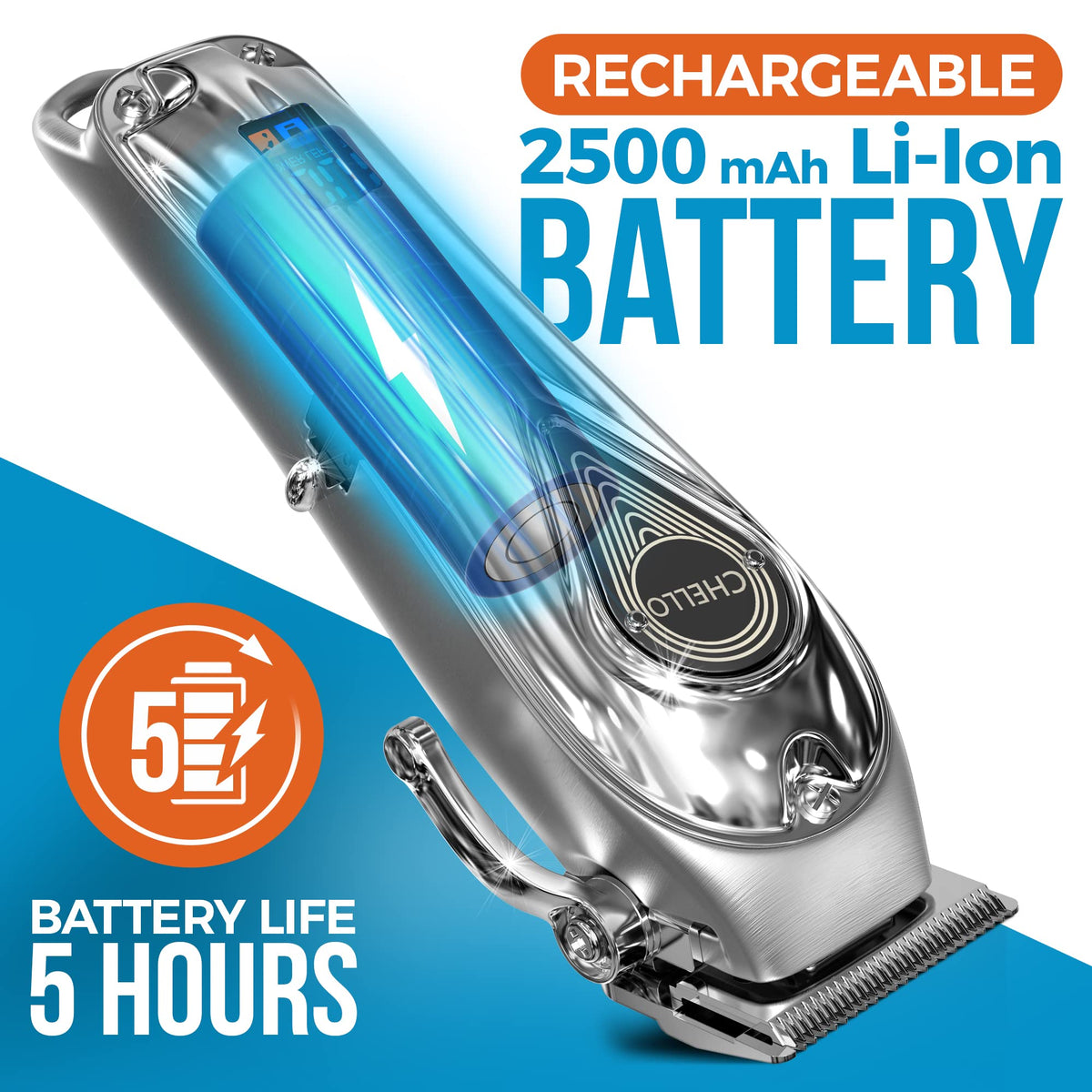Q: How long does the battery last on the CHELLO Professional Dog Clippers?A: The CHELLO Professional Dog Clippers feature a built-in Li-on battery that provides up to 5 hours of run time, allowing for extended grooming sessions without the need for frequent recharging.