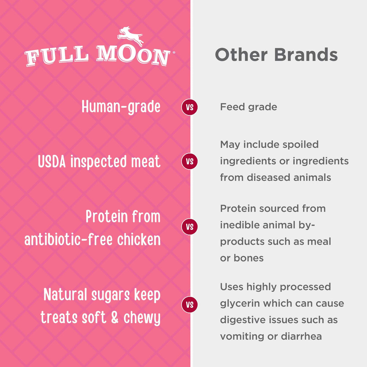 We believe dogs deserve food that is just as good (dare we say better?) as our own. This commitment drives our choices, from how we raise our animals, to the ingredients we choose, to the kitchens we use. Youll notice the difference the second you open a bag of our natural dog treats. Our Full Moon treats are made with love in the USA. We work exclusively with the trusted family farmers and ranchers weve been in business with for years, ensuring that animals are raised to the highest ethical standards. Every bite begins with USDA-approved, human-grade meat- cooked in gleaming kitchens using only 100% natural ingredients-and ends with a satisfied pup. Each of our healthy snacks, like Full Moon Chicken Strips, are free of artificial preservatives, colors, or flavors and full of things dogs love. Glycerin and fillers like corn, wheat, and soy have no place in our recipes. In other words, we only use simple, natural ingredients youd find in a grocery store and likely eat yourself, like real chicken breast, rosemary, and organic cane sugar. Unlike most pet food, we slow cook our treats in small batches using time honored techniques like smoking and roasting to retain more of the foods nutritional value and flavor. It results in a far better product that we think your pup will appreciate. And if youre lucky, theyll share! Check out our full line of Full Moon Pet treats and training dog treats, including Wild and Organic Jerky, today!