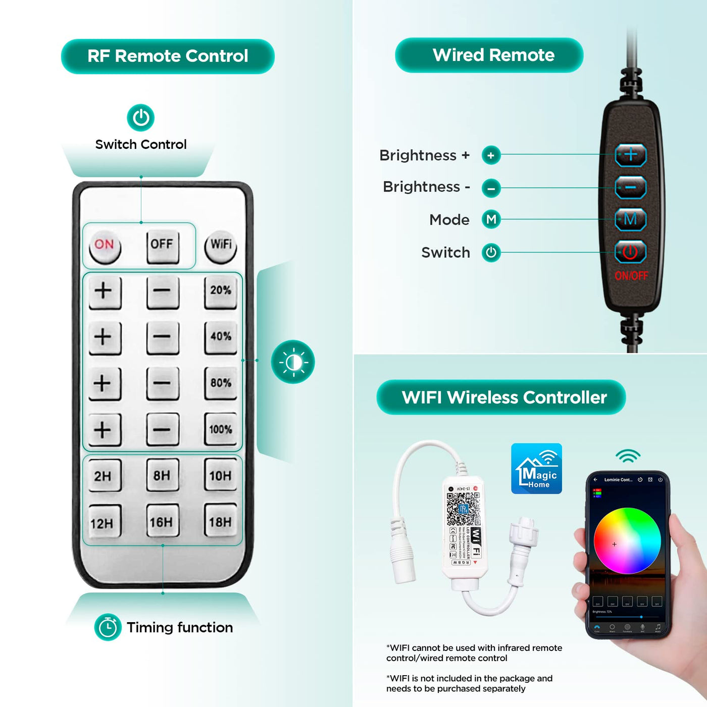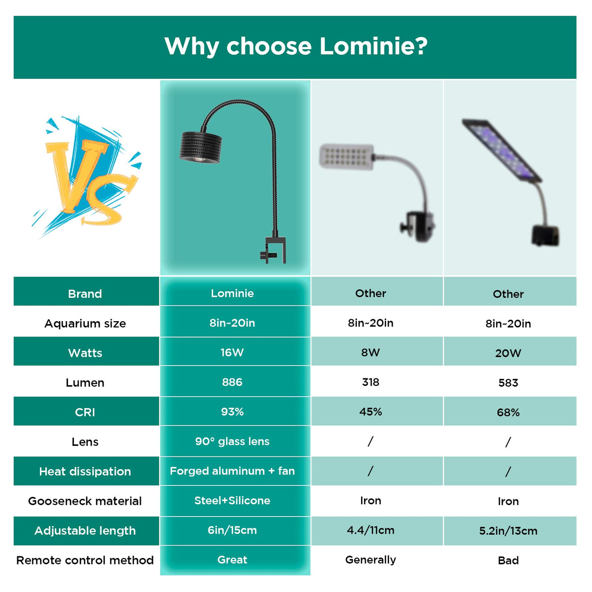 4 CHANNEL FULL SPECTRUM: Lominie F20 16W aquarium plant light, with 4 built-in lighting modes, makes the water in the aquarium look more crystal clear. 24/7 natural Light Cycle(sunrise, midday, sunset and night),customizing colors, auto on and off, give you what the aquarium really needs | HIGH BRIGHT: Lominie fish tank light with 16pcs high-quality LED, 6933K color temperture, provides a splendid soft lighting environment for your fish and fish tank landscape, which promotes a better color synthesis of fish scales and help them grow up | REMOTE SETTING: Lominie Asta 20 aquarium plant light with remote control, you can set up the effects you want at anytime, can also be manually switched, makes your aquarium and the fish more beautiful. And you also use smart device to set the light mode. Please note: you need to order the WIFI controller separately | ADJUSTABLE GOOSENECK: Aquarium full spectrum clip led light has a 360-degree adjustable boom design, which is simple and flexible to operate. You can adjust the aquarium lamp to any suitable position and use it to meet your various lighting angles. the clamp is wide enough for 25mm thick glass, plastic screws won’t scratch the tank glass | SMART CONTROL TECHNOLOGY: Take control of your coral light with the Smart Controller (sold separately). With 4 programmable channels, timing, dimming and group control functions, you can customize your aquarium lighting to suit your needs. Please note that one controller only works for one aquarium lamp
