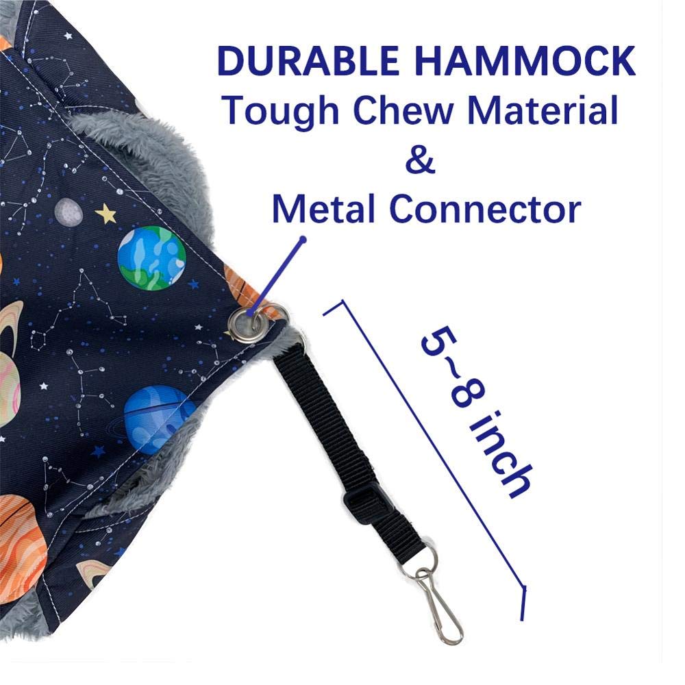 TOUgH cHEW MATERIAL This Hammock outside made of Made of waterproof canvas outside and warm fleece inside With metal clips and clip connectors keep small pet from chewing on it Especially suitable for ferret hammock rat hammock guinea pig hammock VERSATILE HAMMMOcK2-in-1 Design converts to a Hammock or Sleeper Bag small pet rats ferret guinea pig can either lay on the top or curle up inside Very suitable as a pet toy SUITABLE SIZE FOR ANY SMALL PETHammock measures bottom length and top length of 138 inches and a depth of 10 inche perfect for 2Ferrets or More Adult Rats guinea Pigs EASY TO ATTAcHUpgrade the hook with 18inch hook with 2 metal ring more sturdy it fits all pet cages including c&c Midwest and other cagesc&c cage Midwest cage or any cage for Very suitable as pet guinea pigs Ferret rats cage accessories EASY TO cLEANIn Washing Machine or Hand Wash (Please remove 4 hooks before laundering