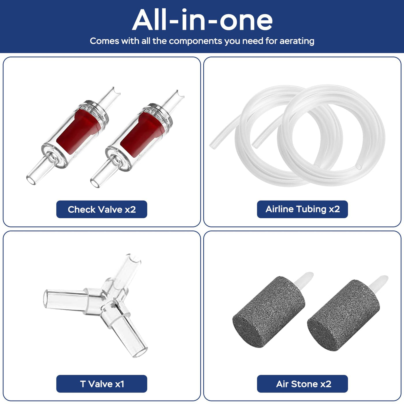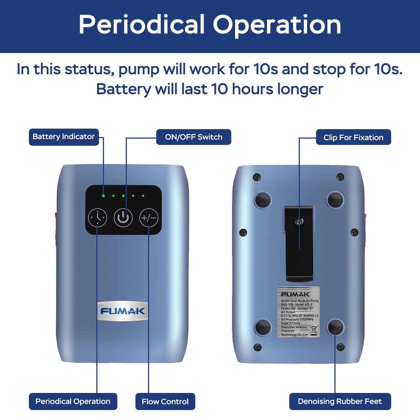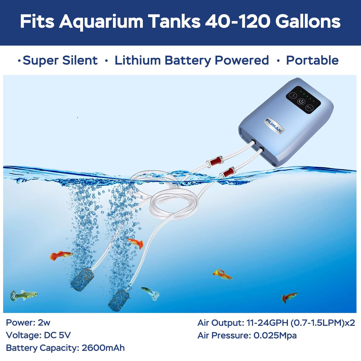 This portable aquarium air pump works as a standard aerating / oxygen pump for aquariums, and an emergency pump when there is a power outage; its also perfect to work as a fishing pump for fishing hobbyists. The package includes: 1 x air pump, 2 x airline tubing, 2 x check valve, 2 x air stone Technical Data: Power: 1Watt Flow rate: 11-24GPH (0.7-1.5LPM) Air pressure: 0.025MPa Fits 40-120 Gallon aquariums The Features: PORTABLE WITH COMPACT SIZE: The Product dimension:3.66 x 2.56 x 1.69 inches, very easy to carry for fishing. SUPER SILENT: the noise level can be as low as 30dB. AUTOMATIC SWITCH OF AC/DC: The pump can work as a standard air pump with the AC power supply, while when there is a power cut, it will switch automatically to the DC power supply (powered by the lithium battery) FLOW ADJUSTABLE: 2 flow rates available, controlled easily by pressing the +/- button RECHARGEABLE: This pump is with an in-built rechargeable lithium battery, i.e it can be charged by wall charger, power bank, or laptop. The 2600mAh battery can support the air pump to run for 20 hours continuously PERIODICAL WORKING: The pump is also designed with periodical operation feature to save power consumption. In periodical status, the lithium battery can last for 30 hours. When the pump works in low output status, it can even last as long as 40 hours ALL-IN-ONE: All the accessories needed to run an air pump are included in the package: 2 x airline tubing, 2 x check valves, 2 x air stones EXTENSIVE APPLICATIONS: It can be used for both fresh and marine water.