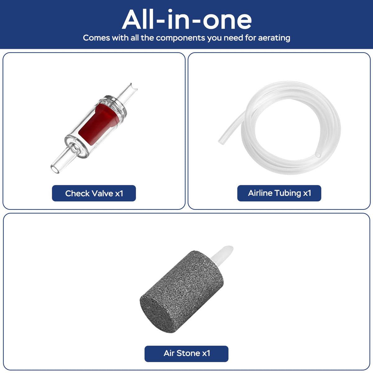 This portable aquarium air pump works as a standard aerating / oxygen pump for aquariums, and an emergency pump when there is a power outage; its also perfect to work as a fishing pump for fishing hobbyists. The package includes: 1 x air pump, 1 x airline tubing, 1 x check valve, 1 x air stone Technical Data: Power: 1Watt Flow rate: 11-24GPH (0.7-1.5LPM) Air pressure: 0.025MPa Fits 10-60 Gallon aquariums The Features: PORTABLE WITH COMPACT SIZE: The Product dimension:3.66 x 2.56 x 1.69 inches, very easy to carry for fishing. SUPER SILENT: the noise level can be as low as 30dB. AUTOMATIC SWITCH OF AC/DC: The pump can work as a standard air pump with the AC power supply, while when there is a power cut, it will switch automatically to the DC power supply (powered by the lithium battery) FLOW ADJUSTABLE: 2 flow rates available, controlled easily by pressing the +/- button RECHARGEABLE: This pump is with an in-built rechargeable lithium battery, i.e it can be charged by wall charger, power bank, or laptop. The 2600mAh battery can support the air pump to run for 20 hours continuously PERIODICAL WORKING: The pump is also designed with periodical operation feature to save power consumption. In periodical status, the lithium battery can last for 30 hours. When the pump works in low output status, it can even last as long as 40 hours ALL-IN-ONE: All the accessories needed to run an air pump are included in the package: 1 x airline tubing, 1 x check valves, 1 x air stones EXTENSIVE APPLICATIONS: It can be used for both fresh and marine water.
