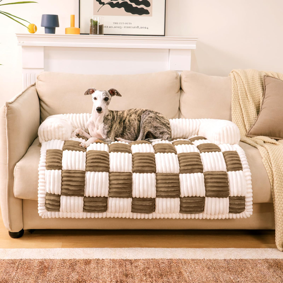 Funny Fuzzy Pet Couch Covers For Sofa, Large Dog Couch Bed Cover Cream Square Plaid Washable Pet Mat For Furniture Protector Sof