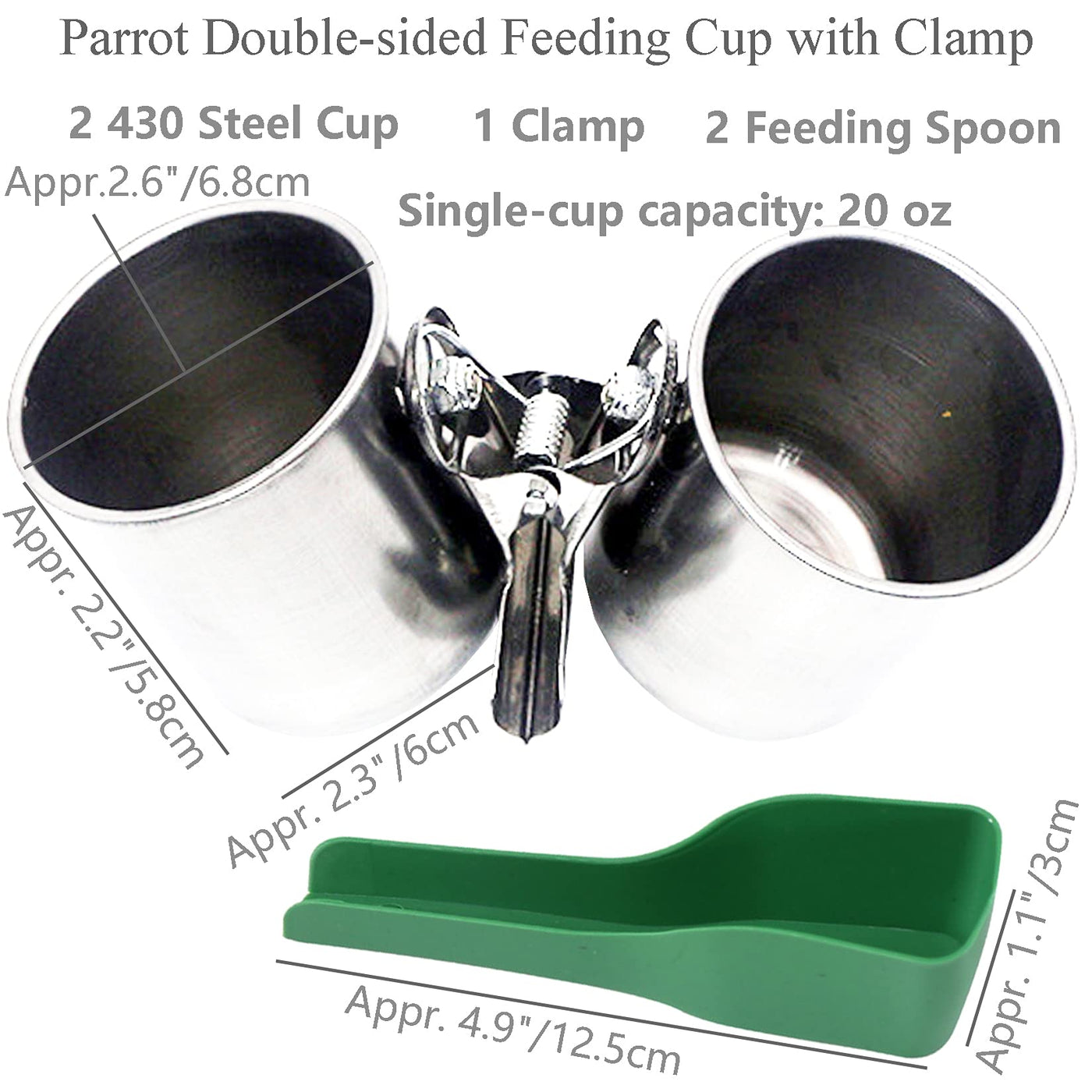 Fuongee Parrot Double-sided Feeding Cup with Clamp Made of 420 steel and ensure its high-intensity quality. Including two cups, it can place food and water at the same time. Stainless steel makes it durable and long life. Cups with a clip are firmer. Can be fixed on the stand holder. Package list: 1 Double-sided Cup with Clamp 1 Feeding Spoon